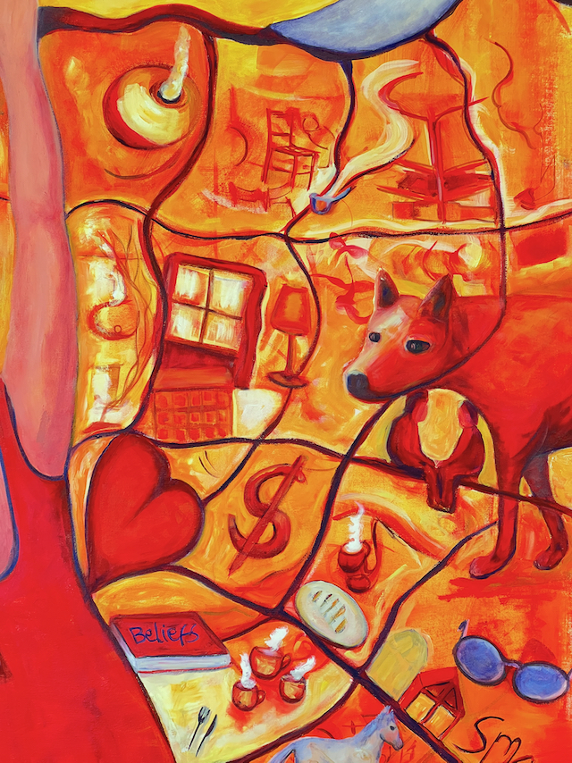 This painting took months to create. It's definitely a painting for someone who wants to be reminded to examine their beliefs. It could be in an office or a home. It will certainly generate a lot of conversation which I hope will be good.