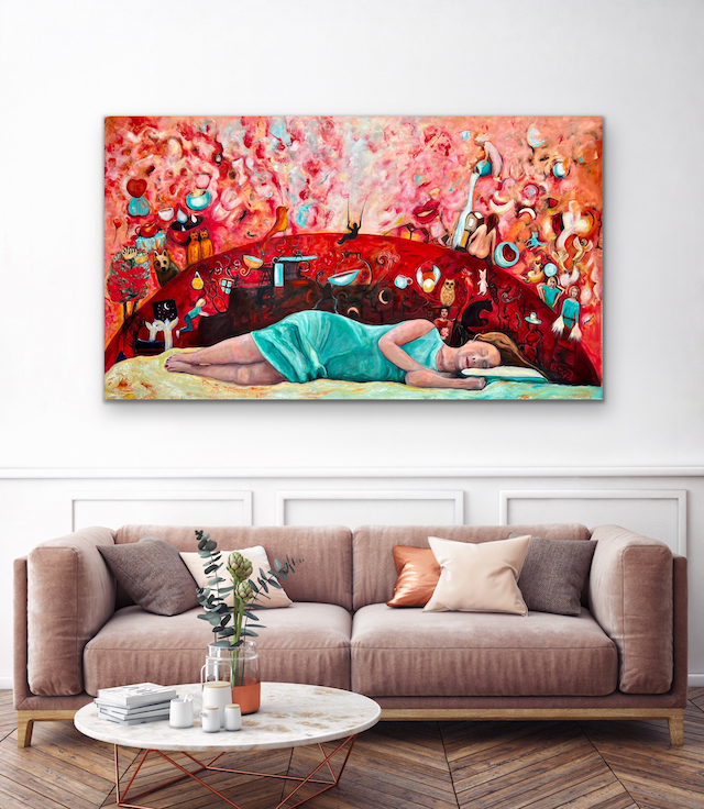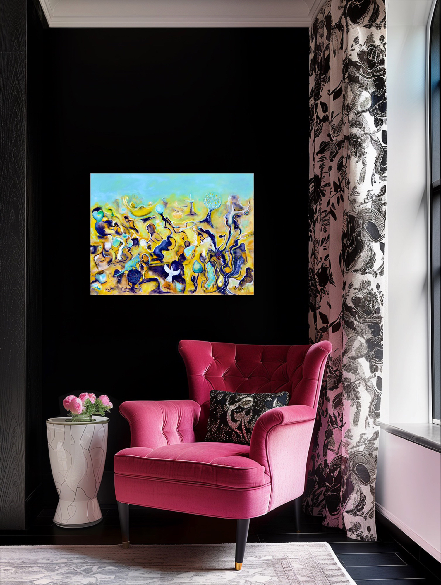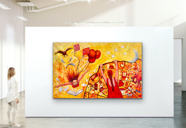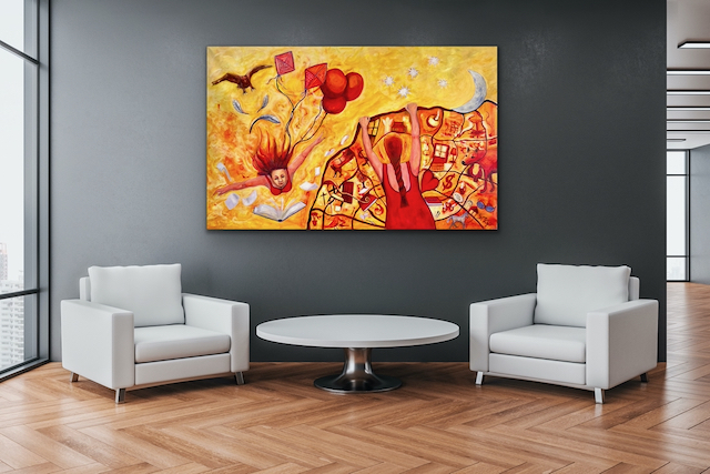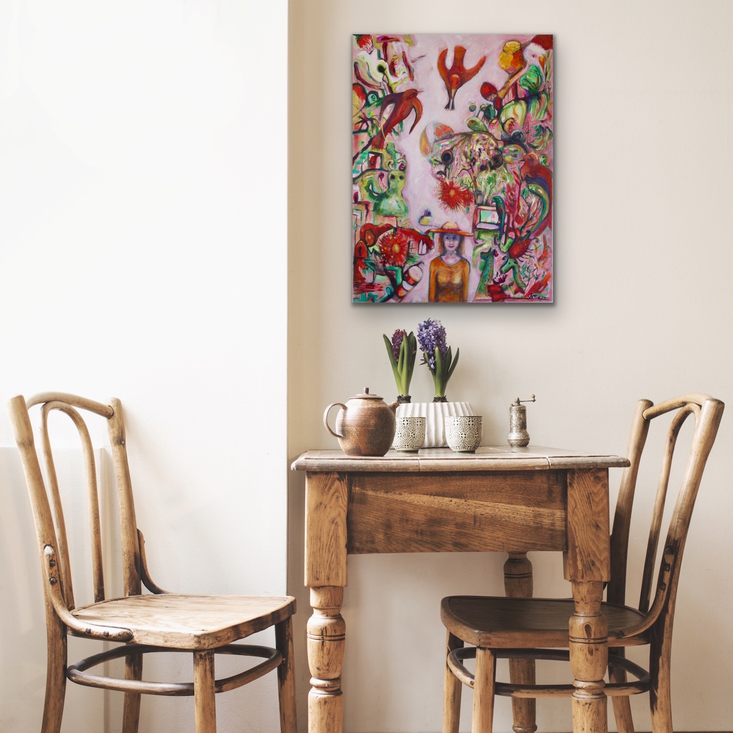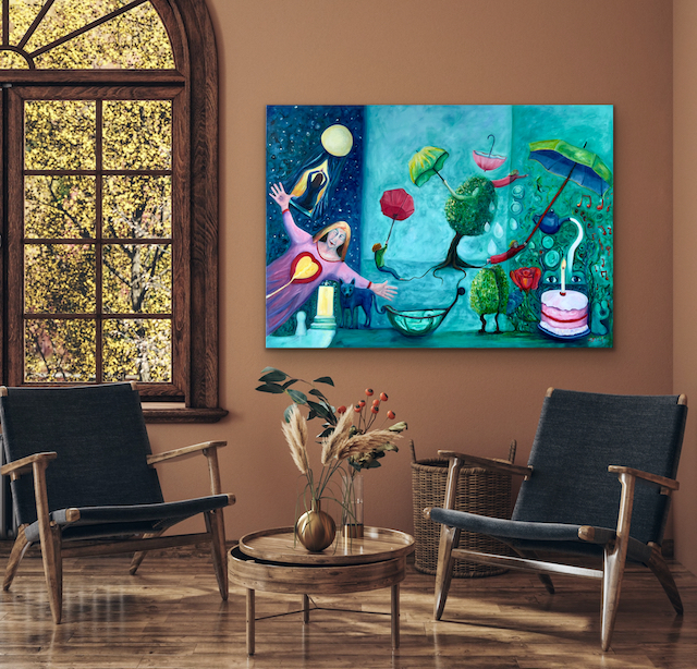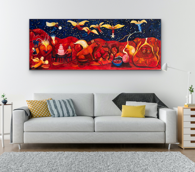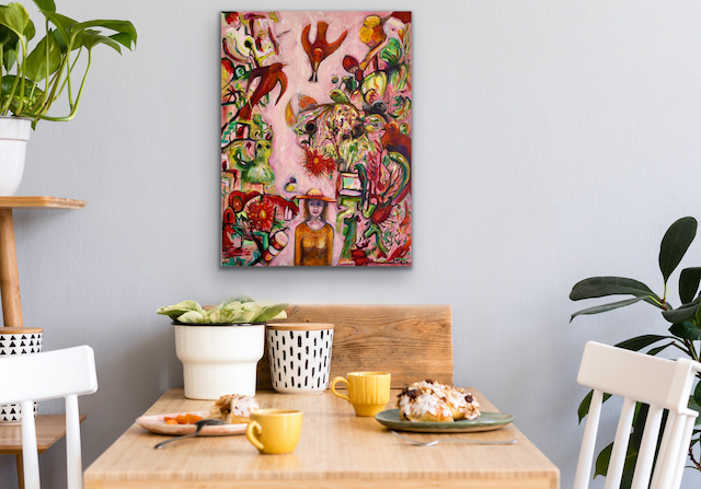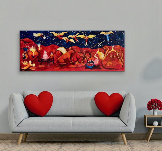 This painting is reminiscent of Marc Chagall.. not deliberate, it's just what comes out of me - I think it will look stunning on your wall! I've shown how it will look stretched and unframed.