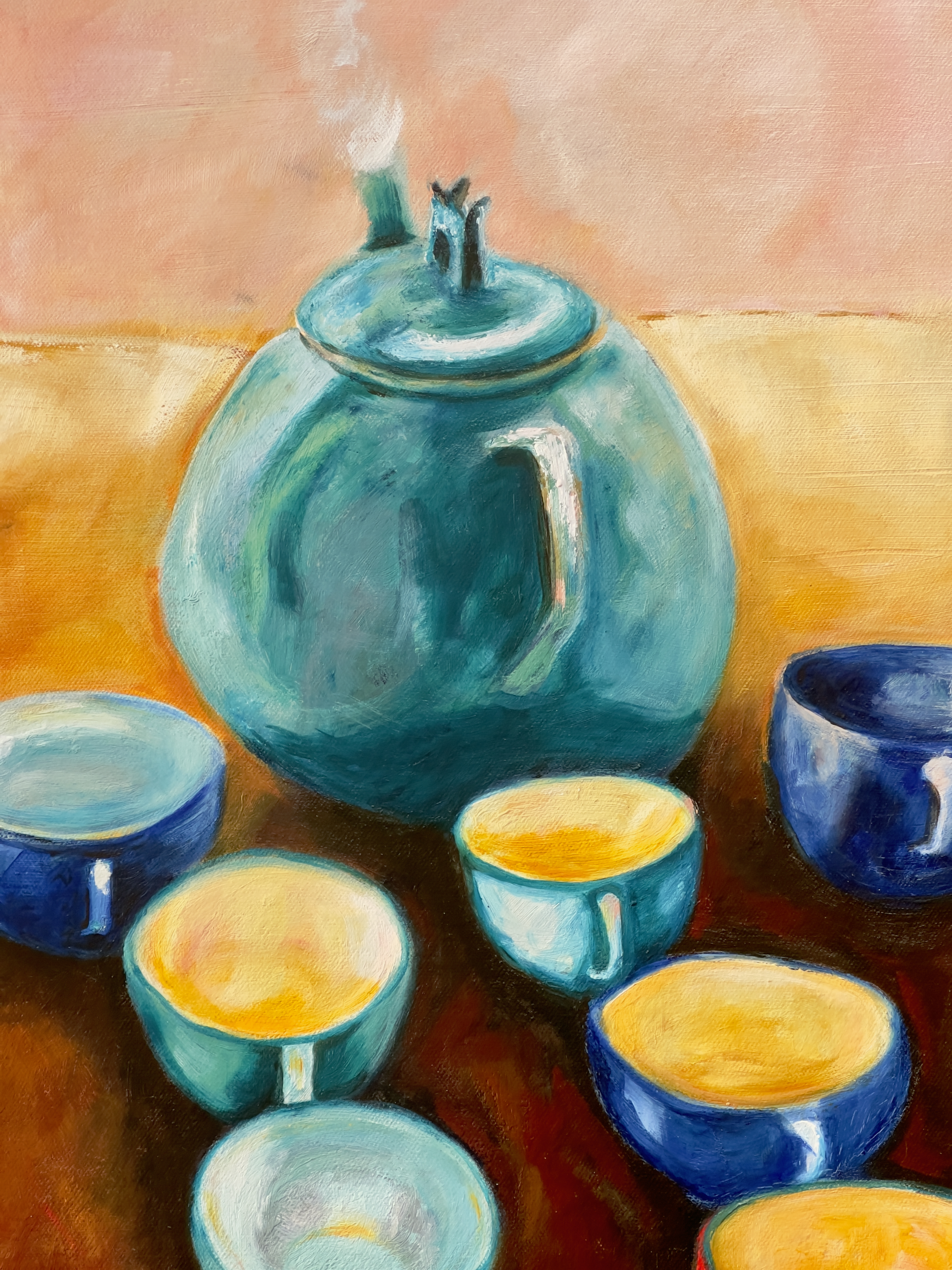 The teapot is the leader of the pack. It is imagining itself in the leading role. The jug is its "wing man", and they are followed by a herd of colourful cups.