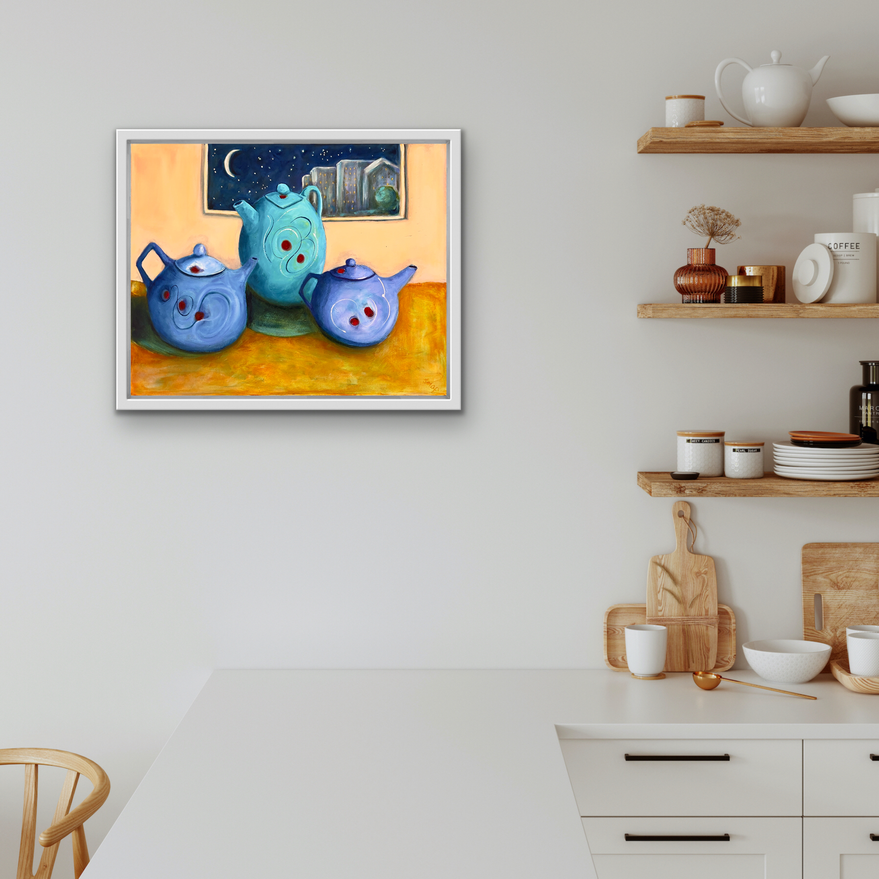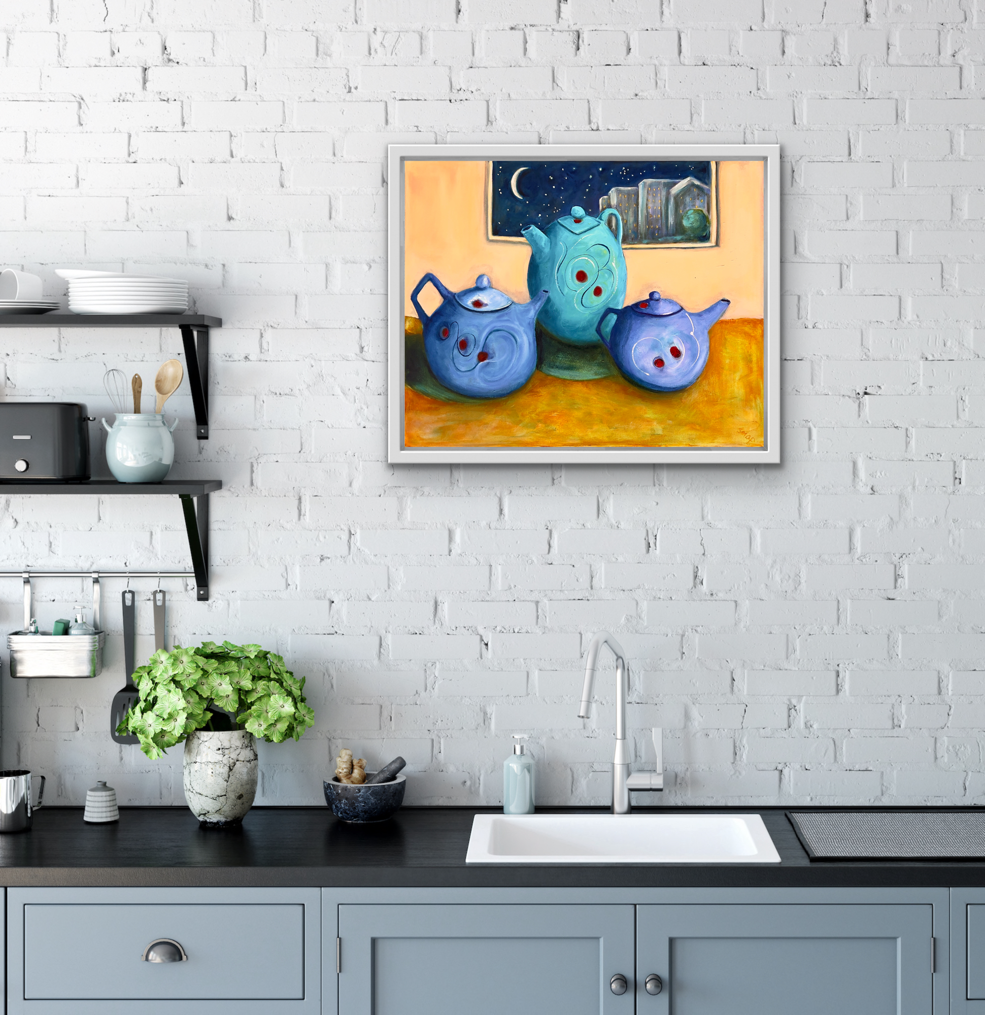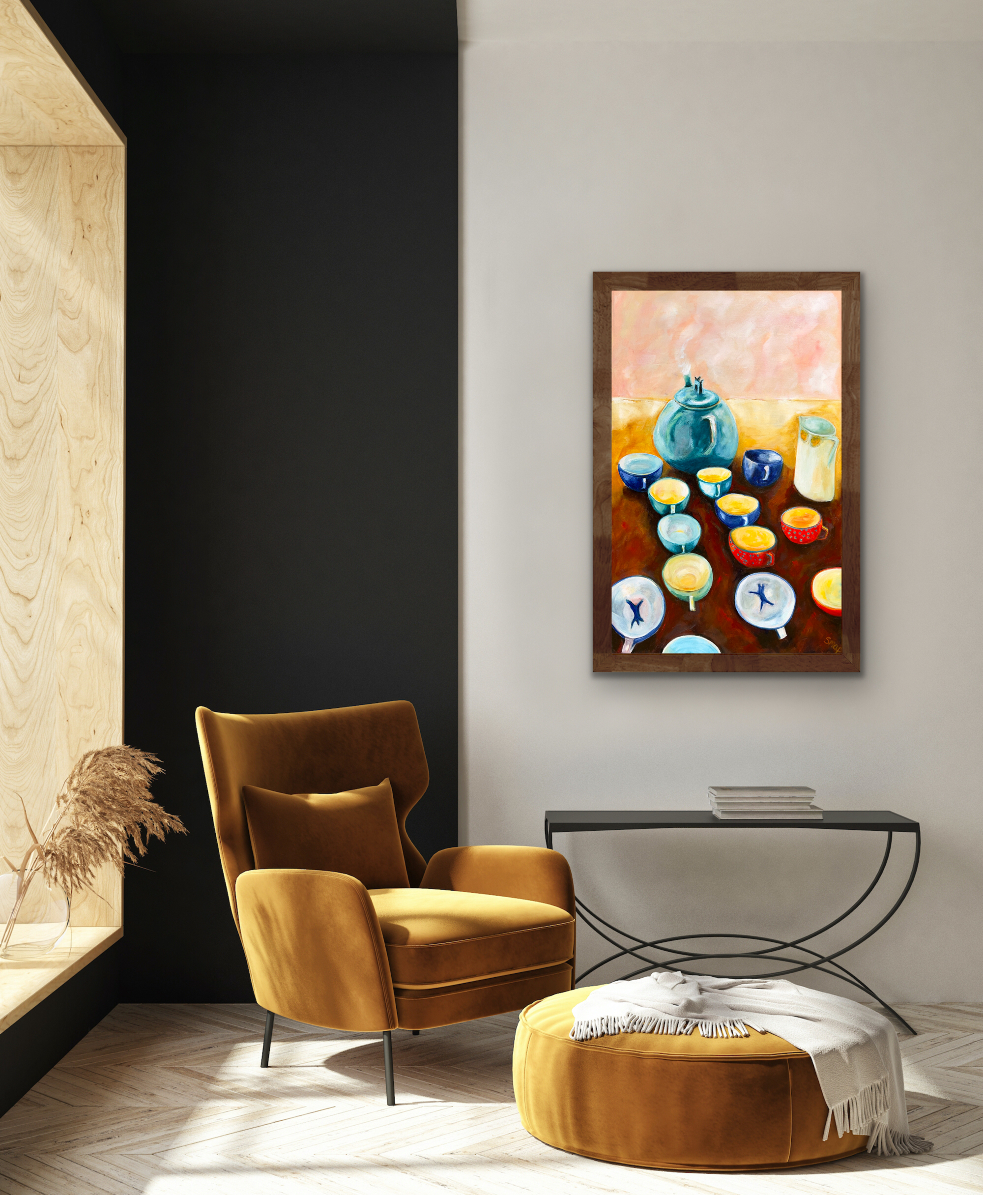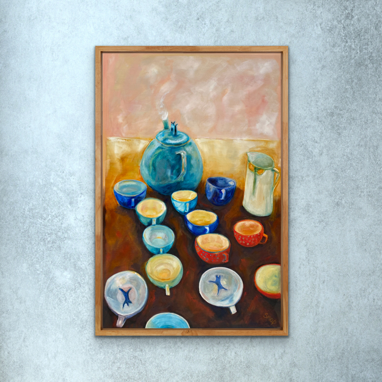I envision this work as perfect for a café or dinner, but equally, it is an eye-catching warm and humourous painting which would grace any place people gather together over a friendly 'cuppa'.