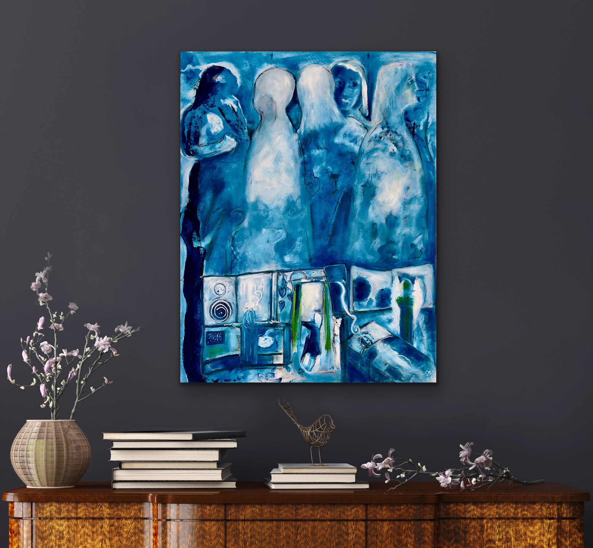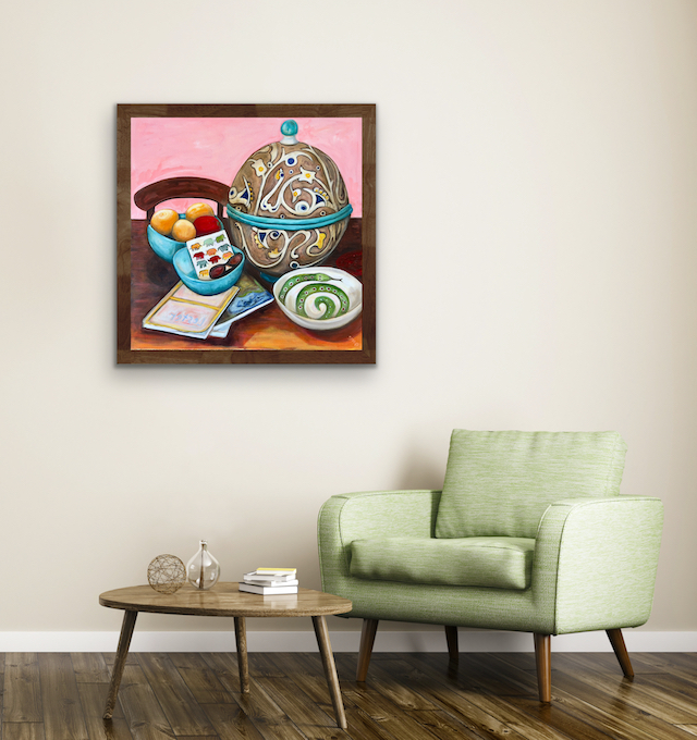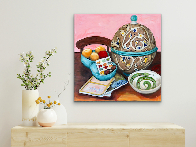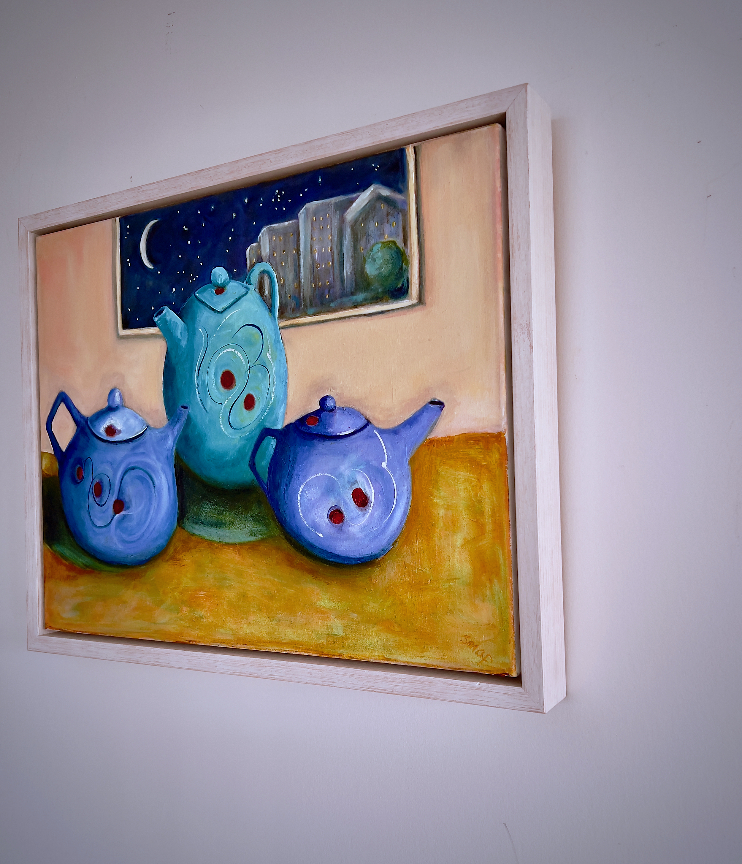 I envision this work as perfect for a café or dinner, but equally, it is an eye-catching warm and humourous painting which would grace any place people gather together over a friendly 'cuppa'.
