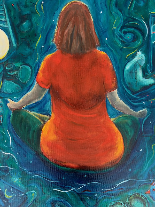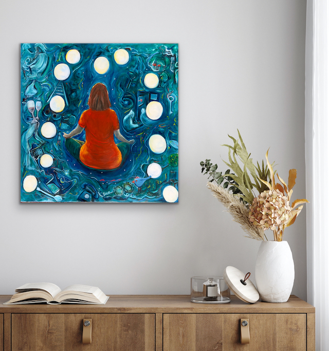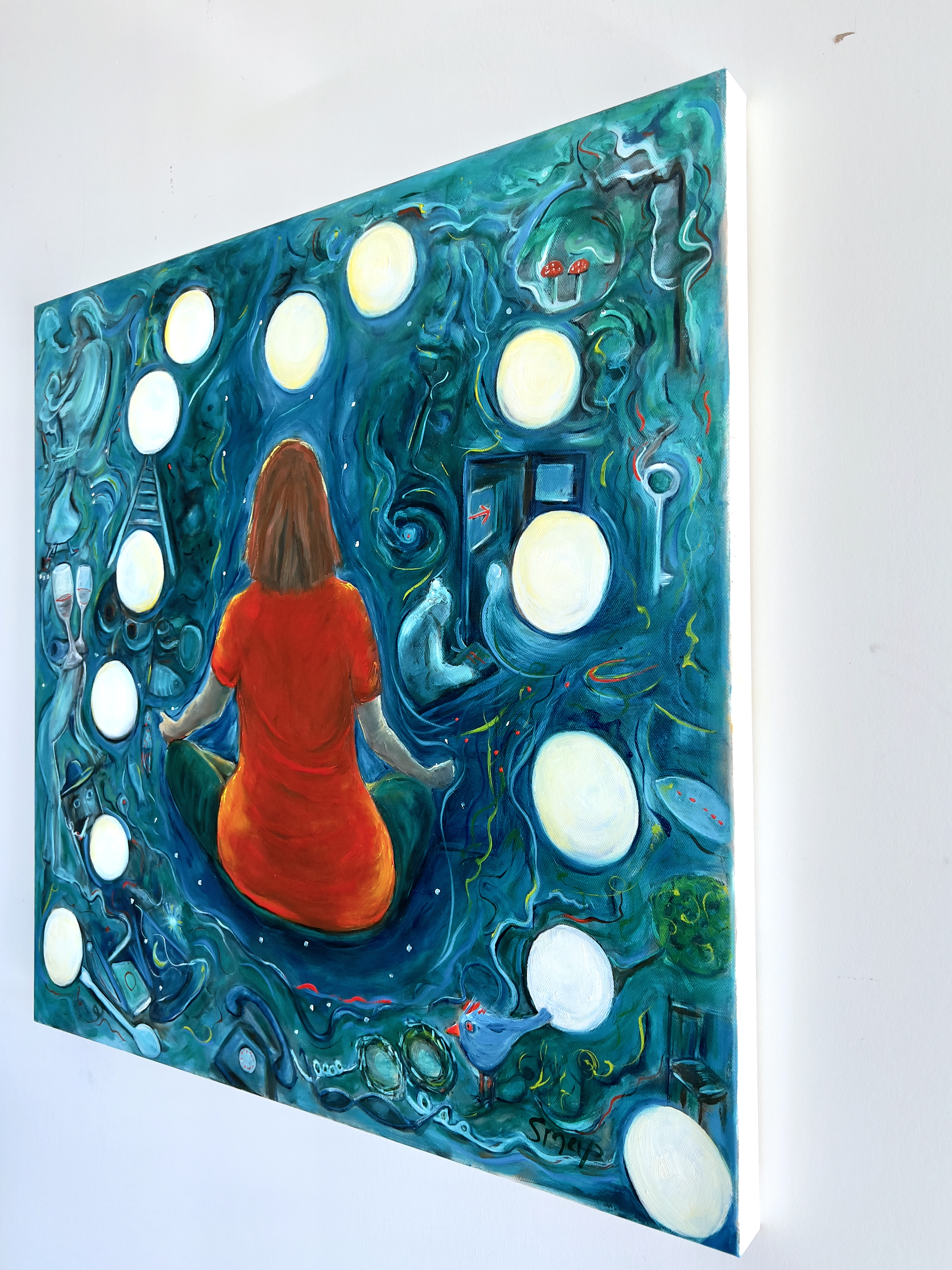 I love painting from my imagination, and the particular process I use helps me find the thing that want to be expressed. In this case, it is about visualising peace in the world, peace in my heart and trying to hold the line amongst the chaos and complexity of life. The painting depicts a woman meditating. She is focused on the balls of light, visualising in each something she would like to manifest. She is aware of the "monkey mind", the ever-present intrusive chatter in our heads whenever we meditate. Still, she focuses on the light, and her vision of her desired creations, practicing still, focused attention.