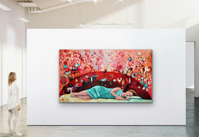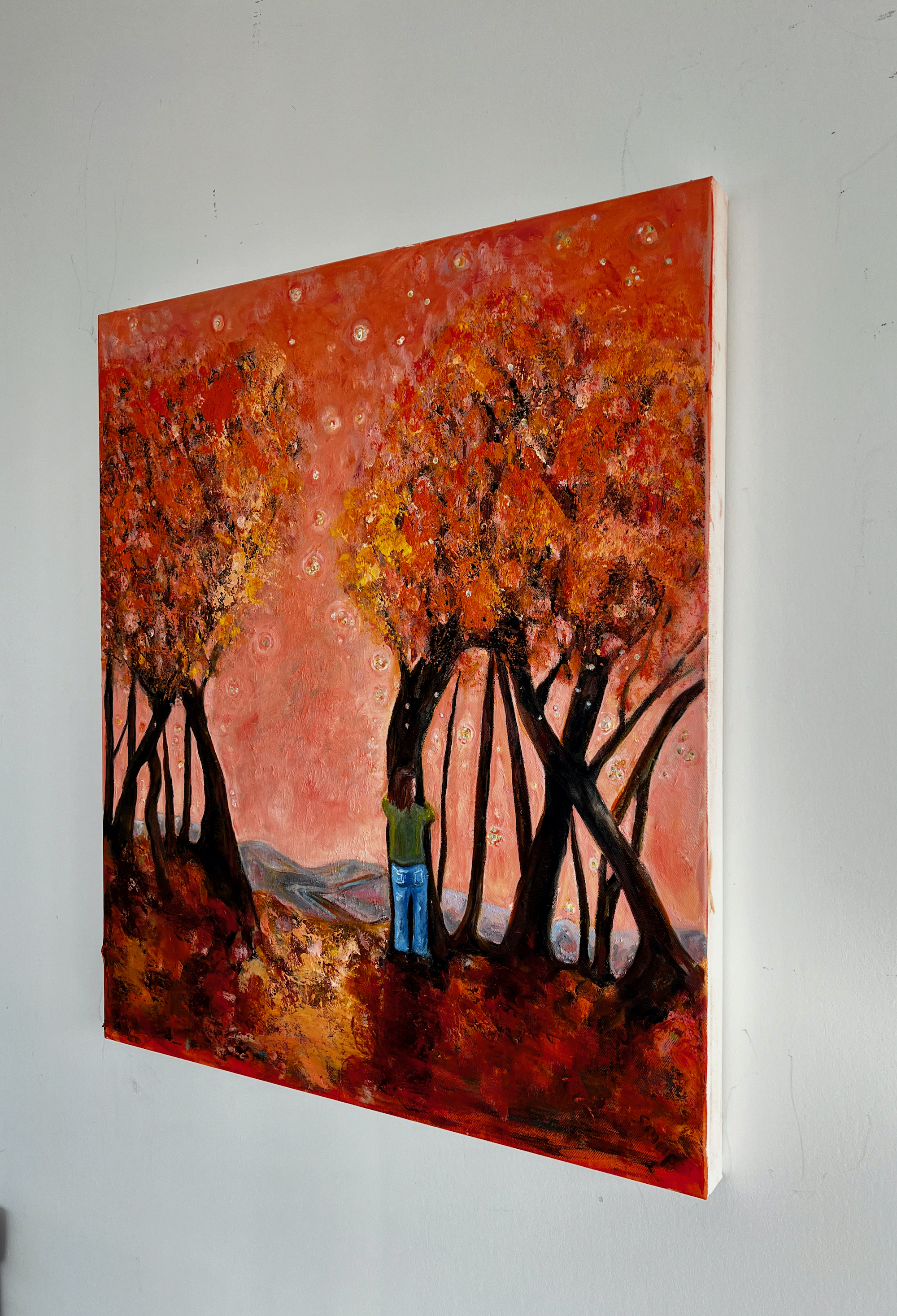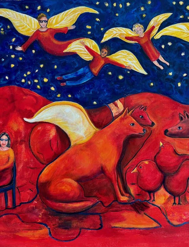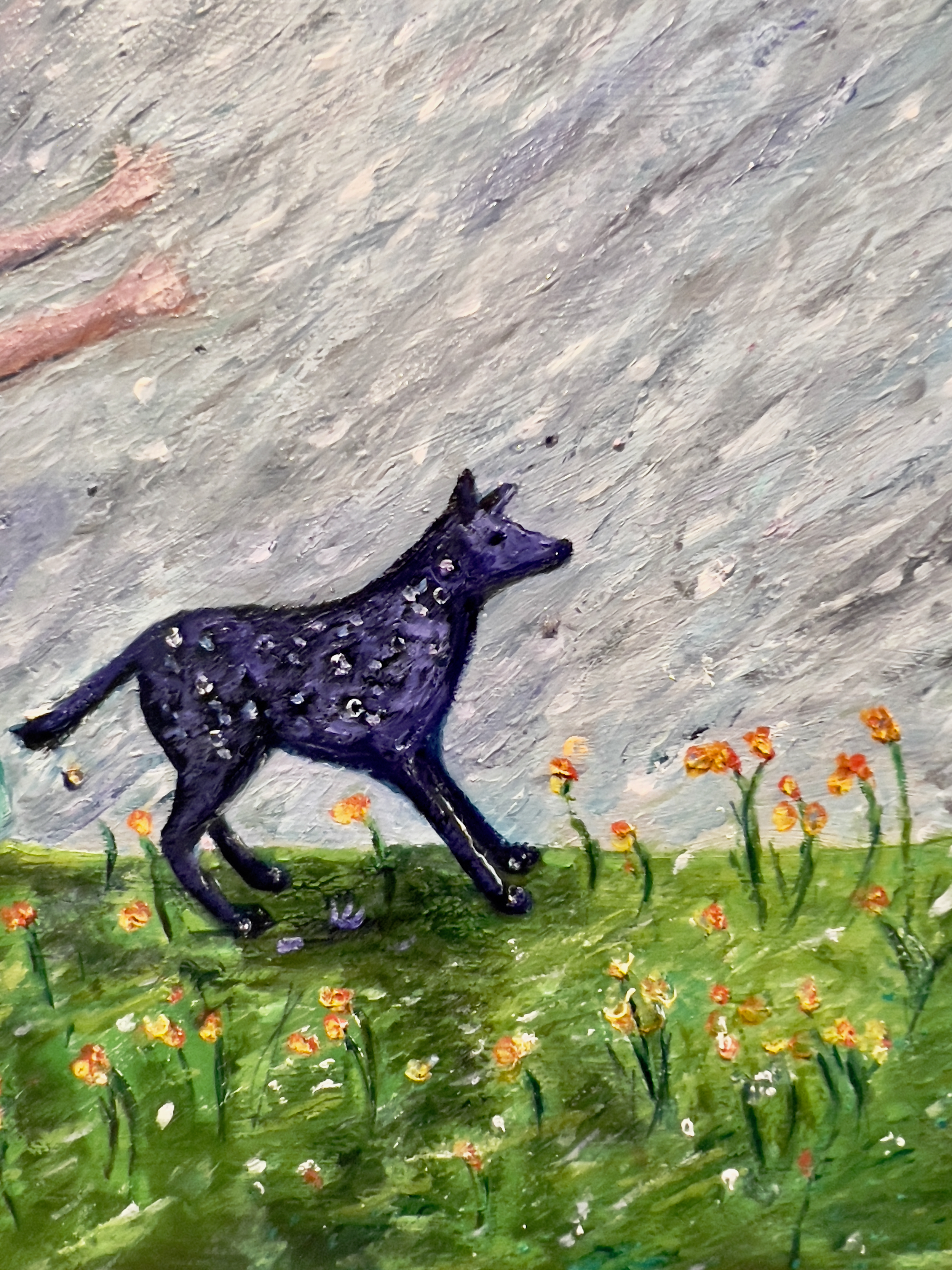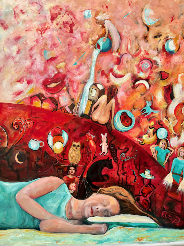 This painting is a dreamscape about connection to higher realms, and our relationship to it and each other.