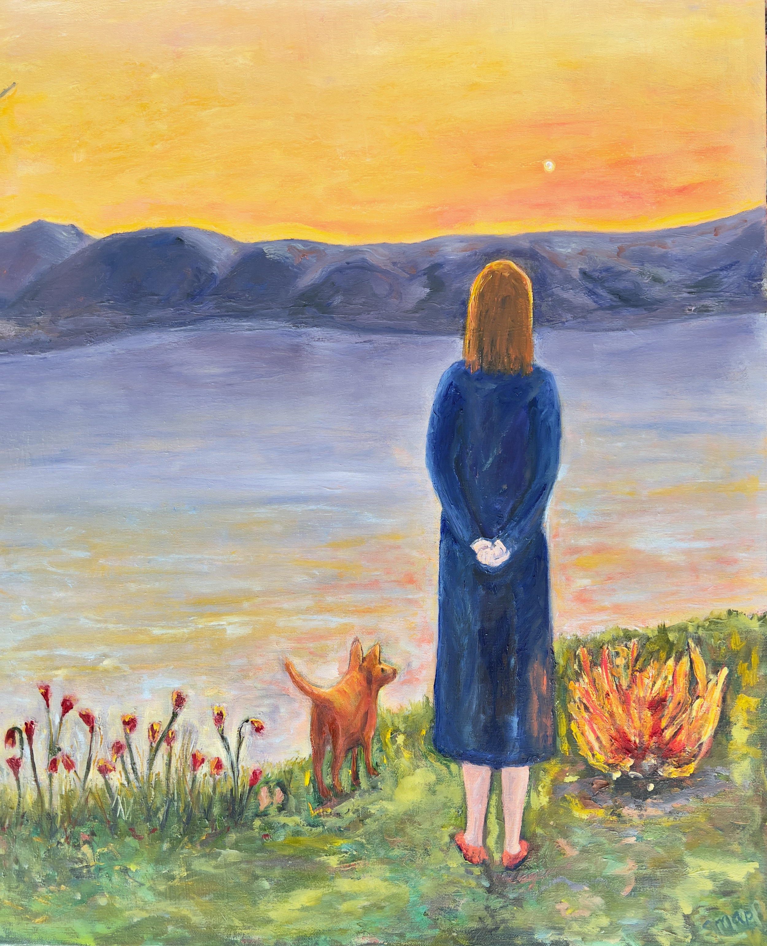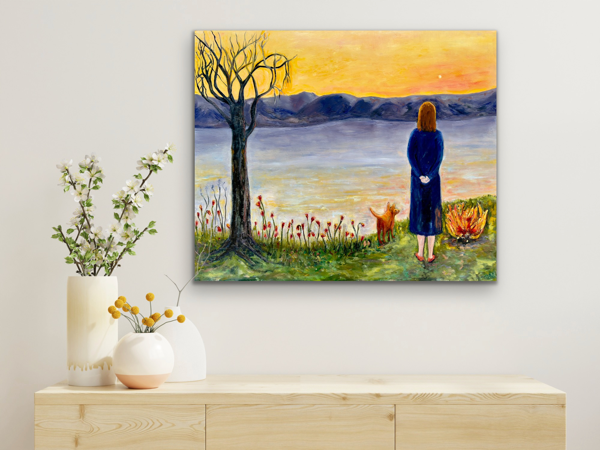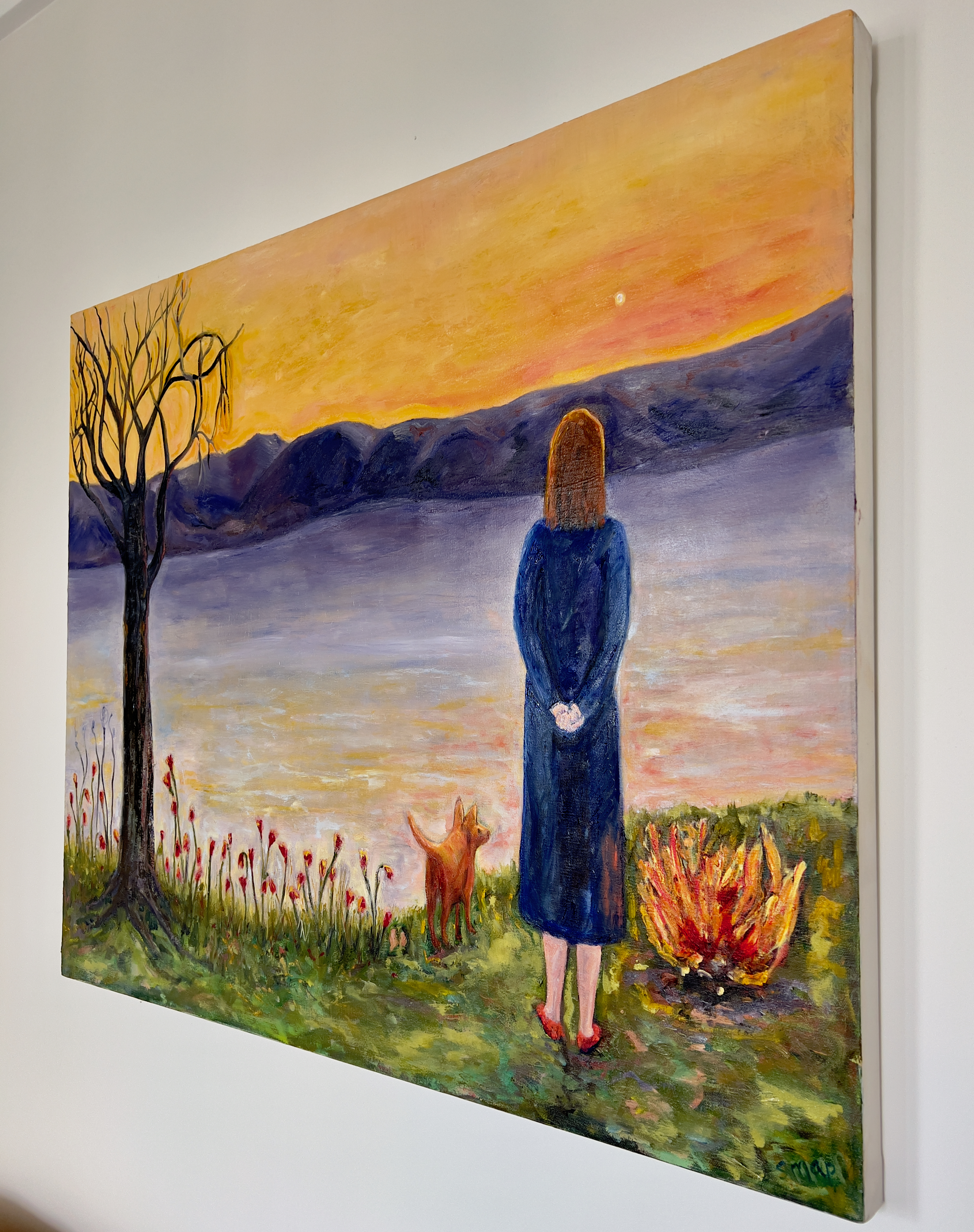 I've always been a dreamer, a daydreamer, and a contemplative person, and this painting comes from that place. You can see it on a couple of levels. Firstly, it is a lovely colourful peaceful painting that reminds us to slow down and contemplate. The symbols of the dog (companionship), fire (warmth) water, mountains, and evening star, are about the potential future. The tree without leaves represents a time of rest and regeneration, and yet there is still growth of beautiful flowers.