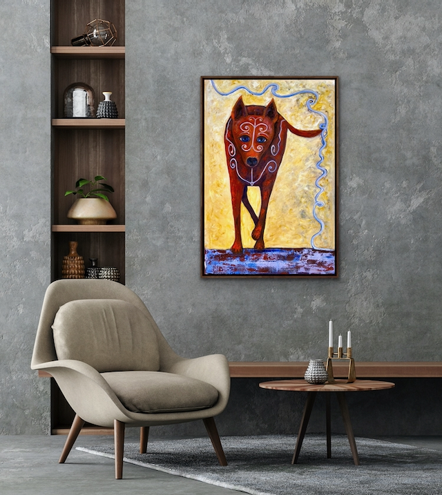 This dog is painted in venetian red and vermillion, (evocative of the red cattle dog), and decorated with Pictish swirls. It moves towards you, with intense blue eyes, on its path forward. He is a powerful chap, and I like to think of him as a guardian spirit and totem. I'm pretty sure he's a he.