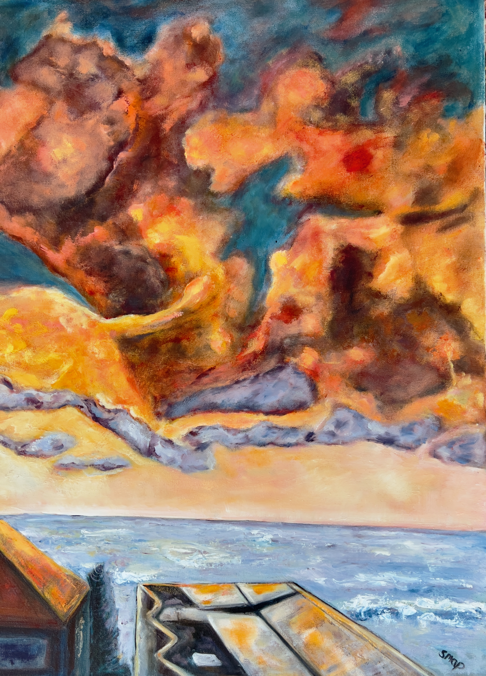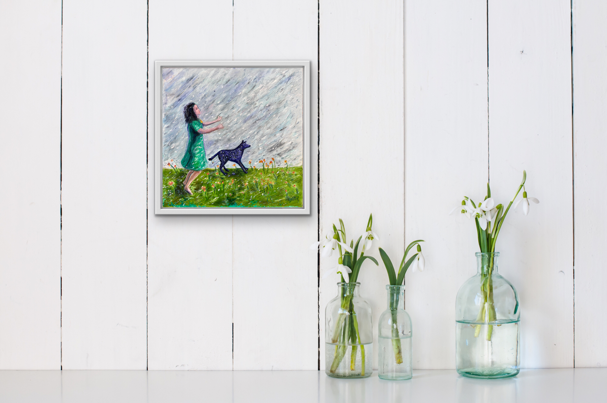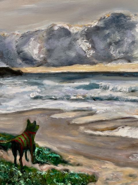 I like spotty dogs. This is a red one reading the breeze as she trots across the rocks. The sky is dramatic and hypnotic. The waves are building. There is a sense of space and freedom in the air. The dog is surreal and symbolic. In my world, dogs symbolise unconditional love, awe, wonder and joy. They embody “the present moment” like no other creature on this planet (as far as I am aware). Perhaps I put them in my work to remind me that all these things are my aspirations.
