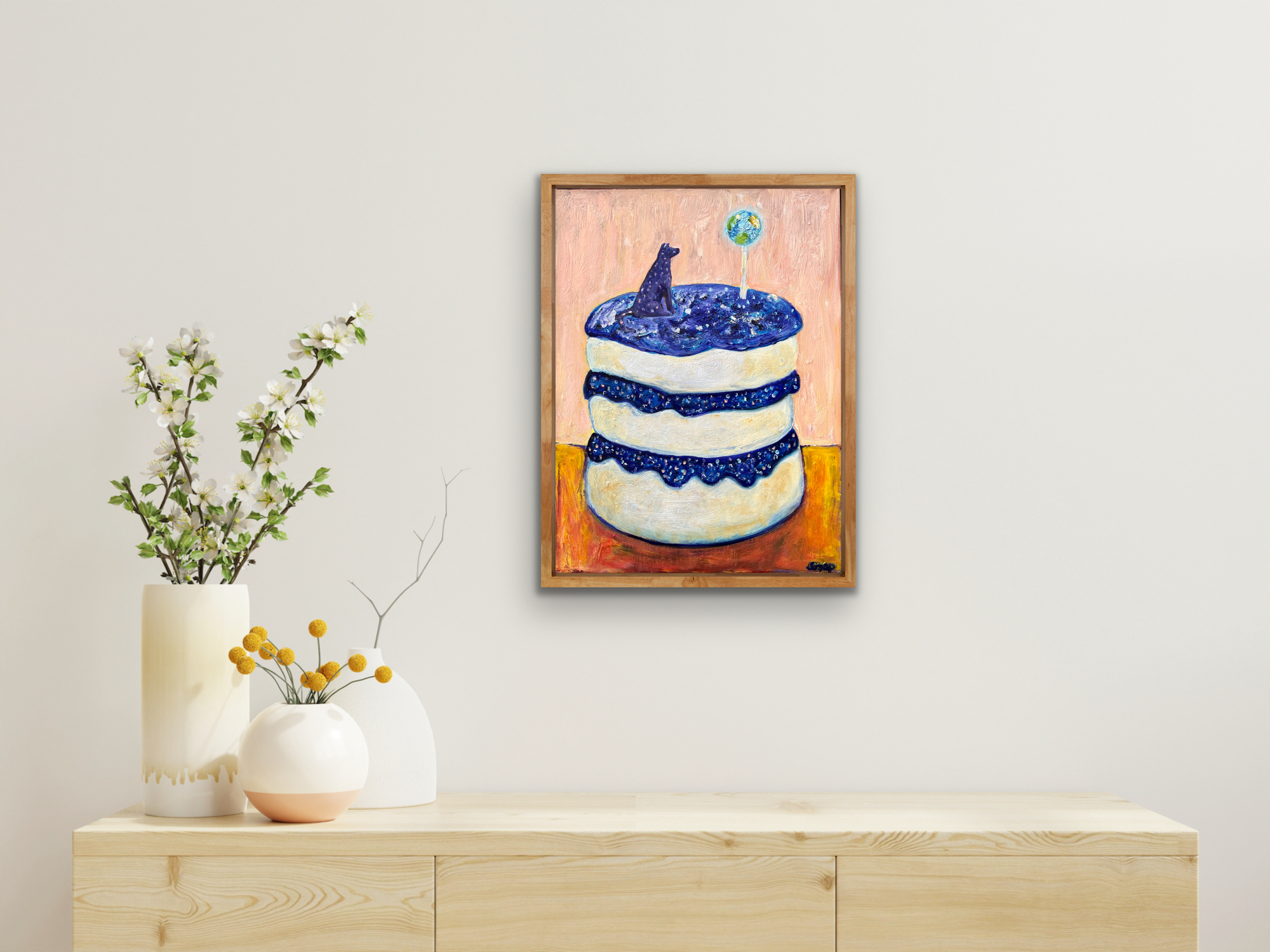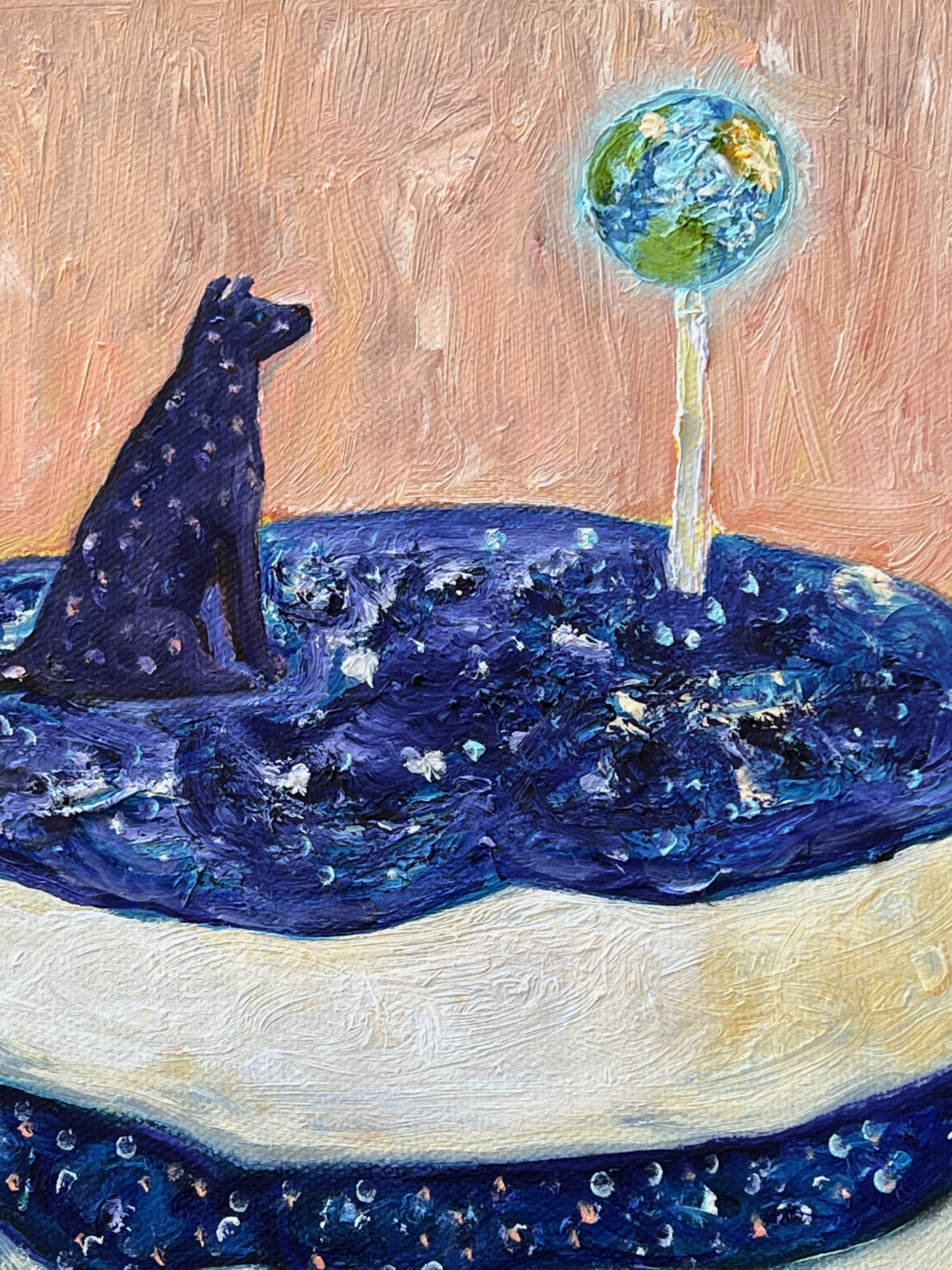This is a painting of one of my cake pots, which I've used as a still-life prop. I have combined my love of all - dogs, stars, cakes, and most importantly the earth. When I include a dog in my images, it's not just because I like dogs. It's because I want to use a symbol that isn't a human being as "the observer". After all, we share this planet with animals and most people don't stop for a second to wonder what their experience of being here is. I make them a bit dreamlike and surreal to amuse or stimulate curiosity.