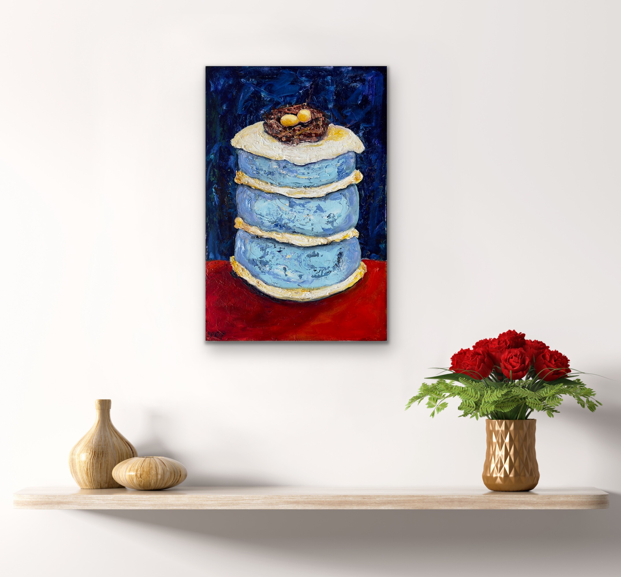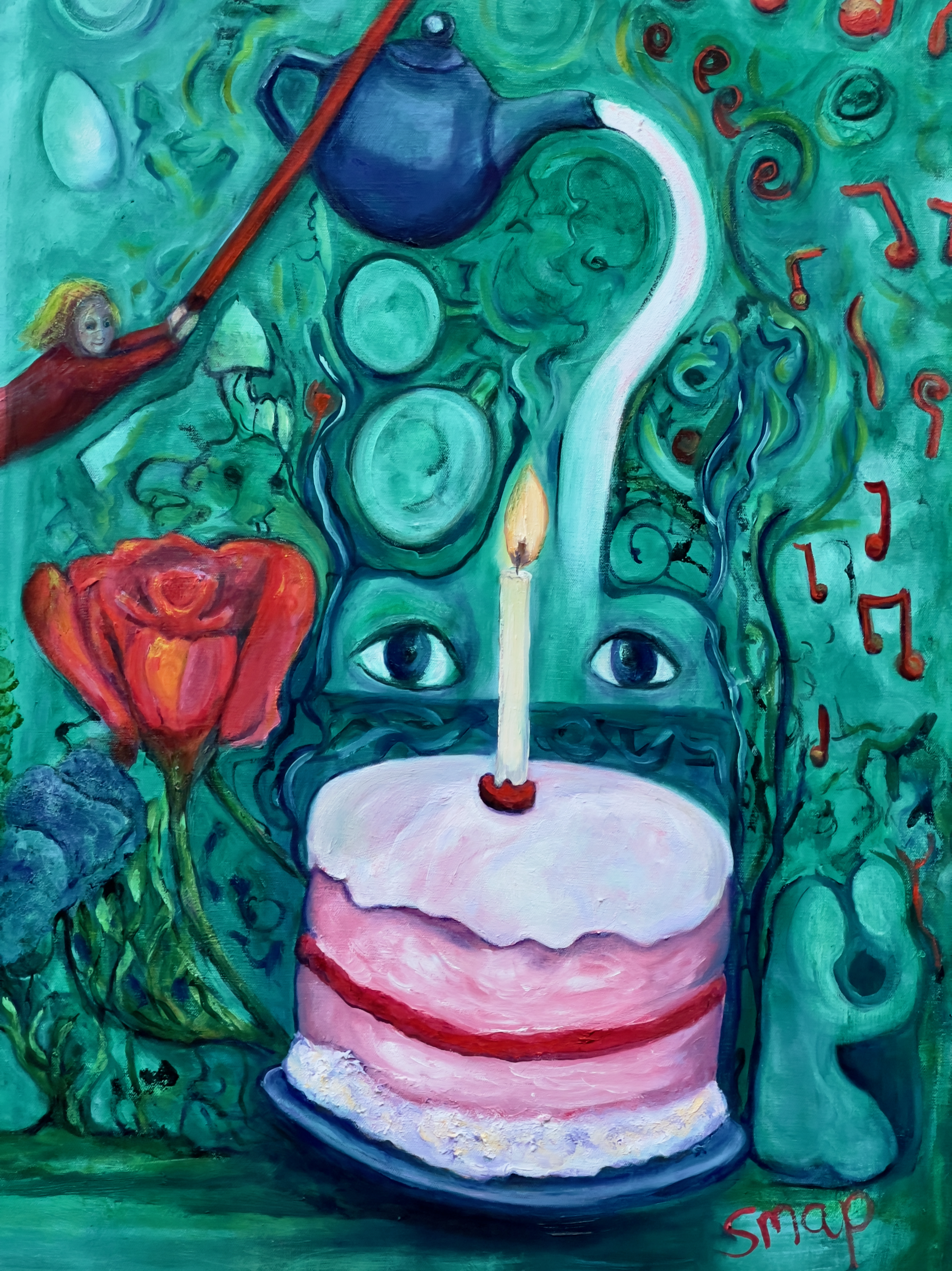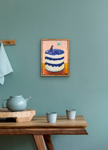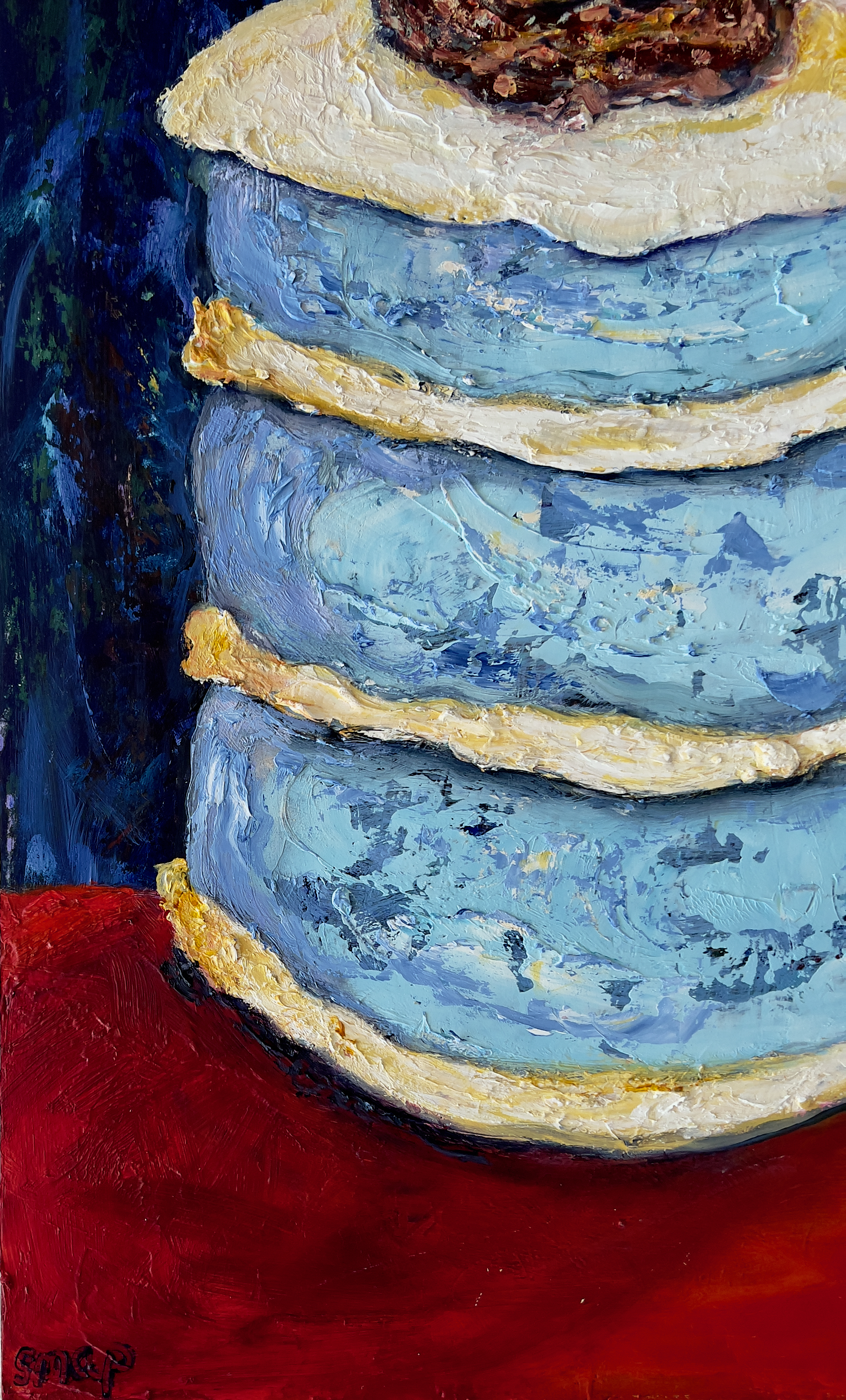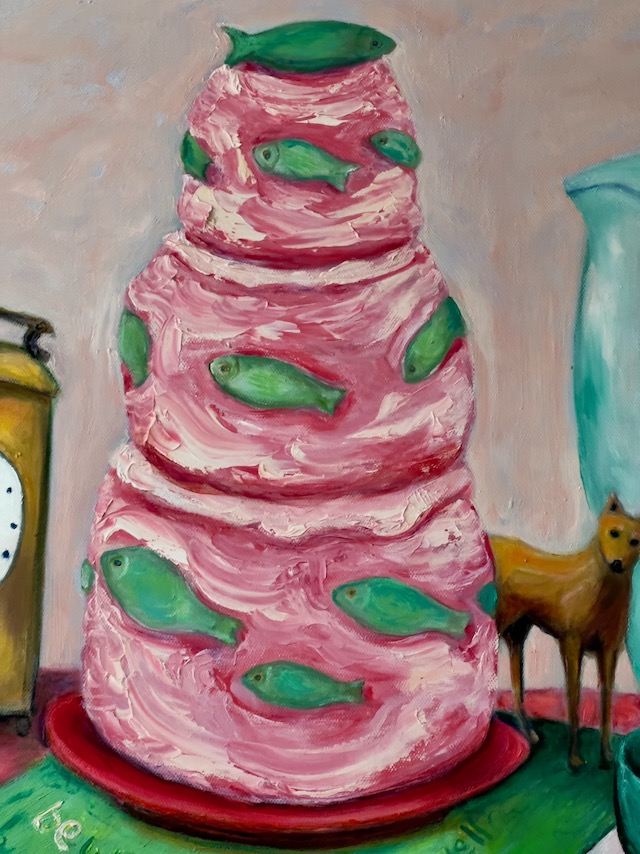 Cakes, who doesn't love a cake? Cakes are comforting. Cakes are fun, and usually, they are delicious too. I've made lots of ceramic cakes with curious little things on top of them. Mainly I use little snippets from my quicky paintings and make them three-dimensional. Now I am reversing the process again, and painting some of the ceramic cakes as slightly surreal still-life paintings.