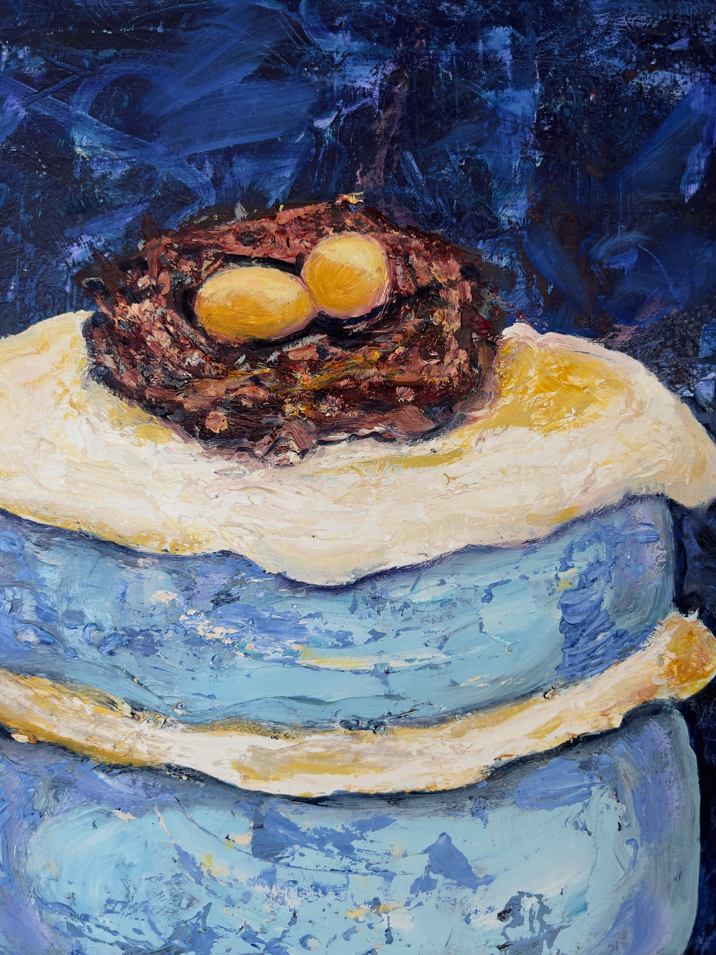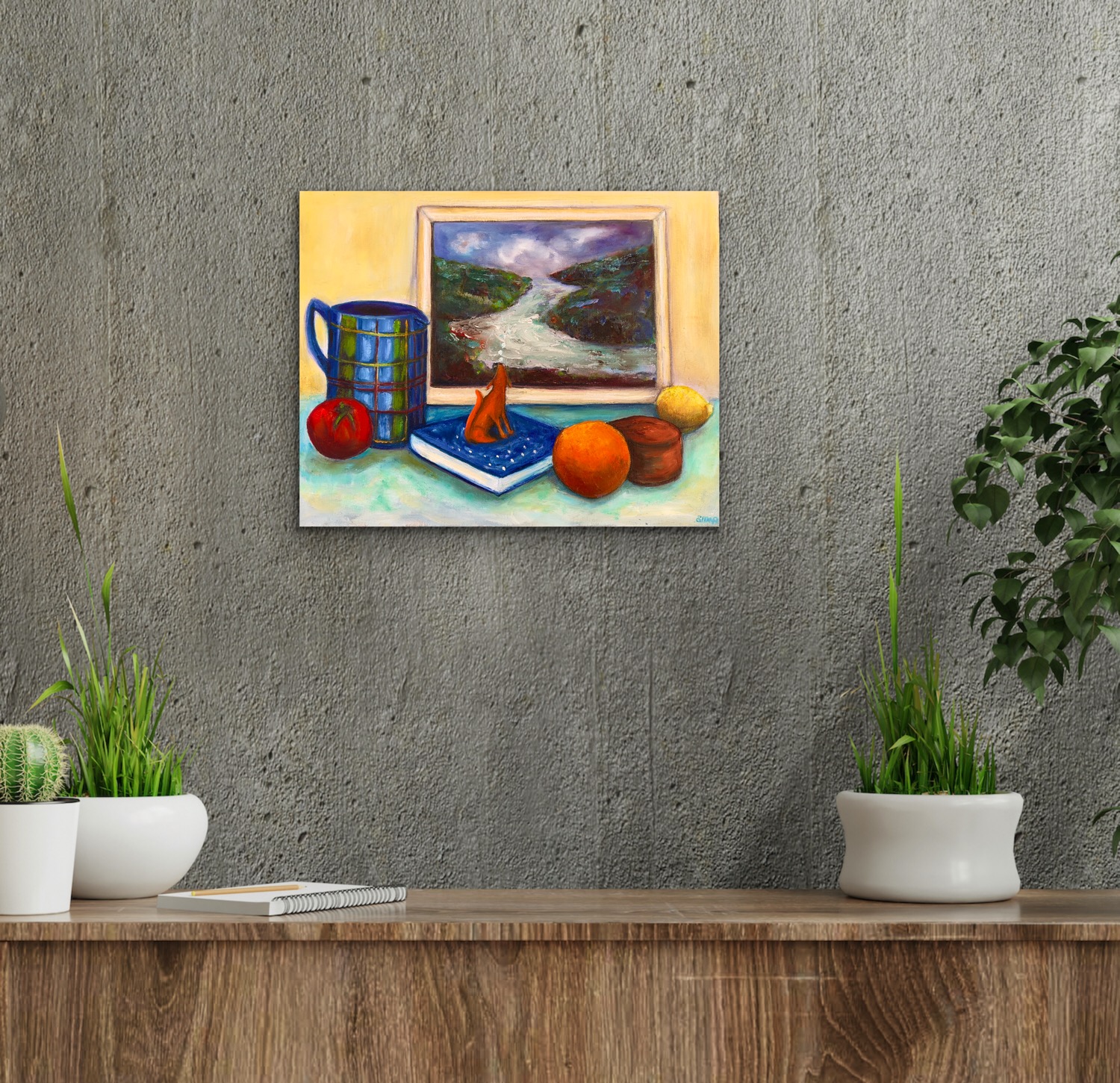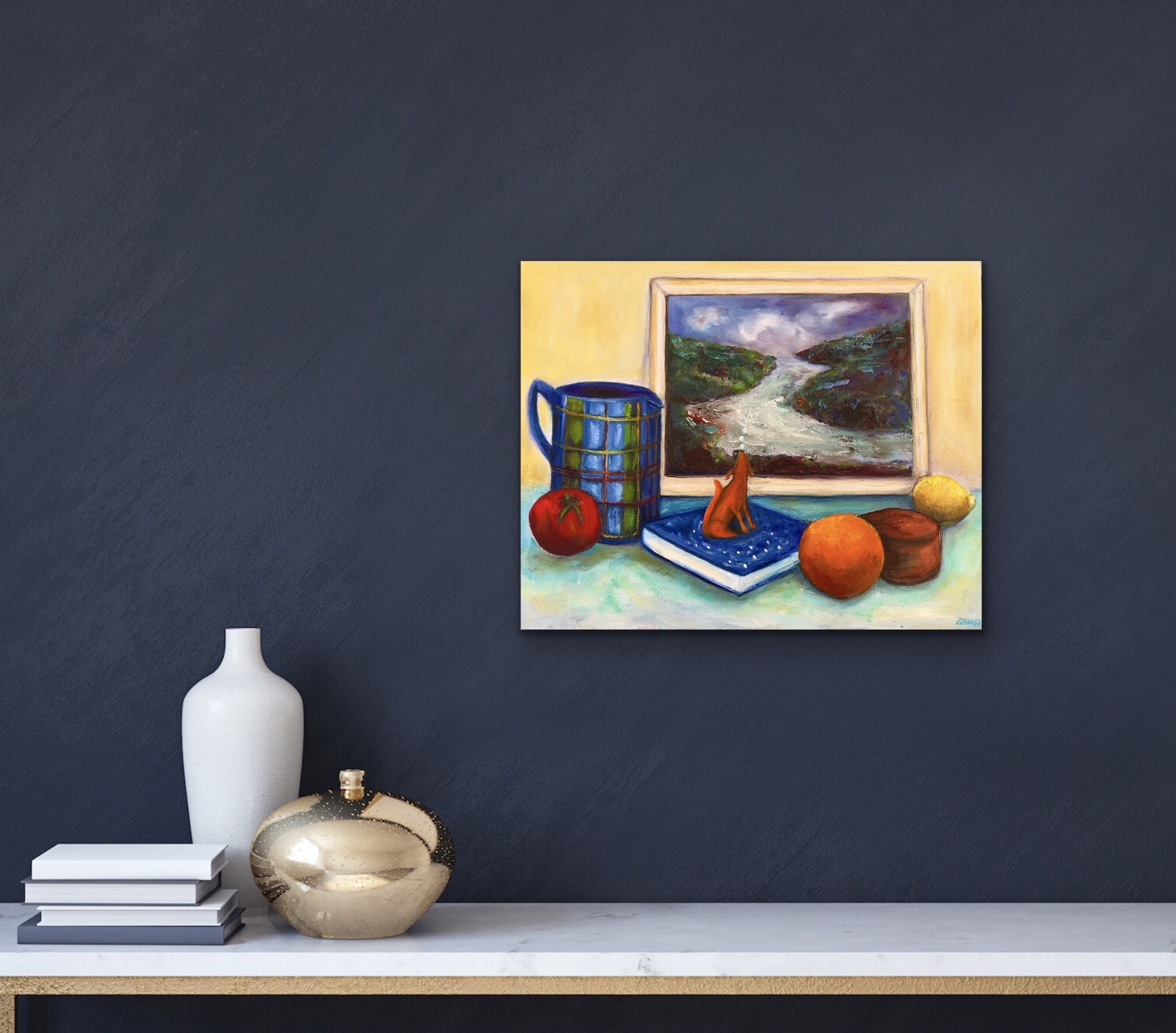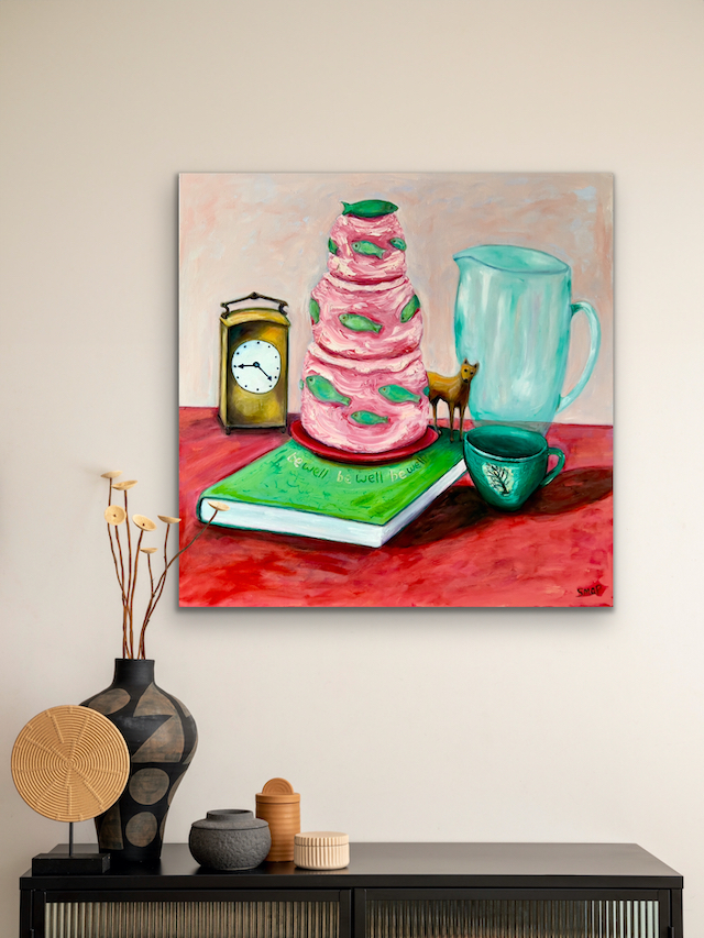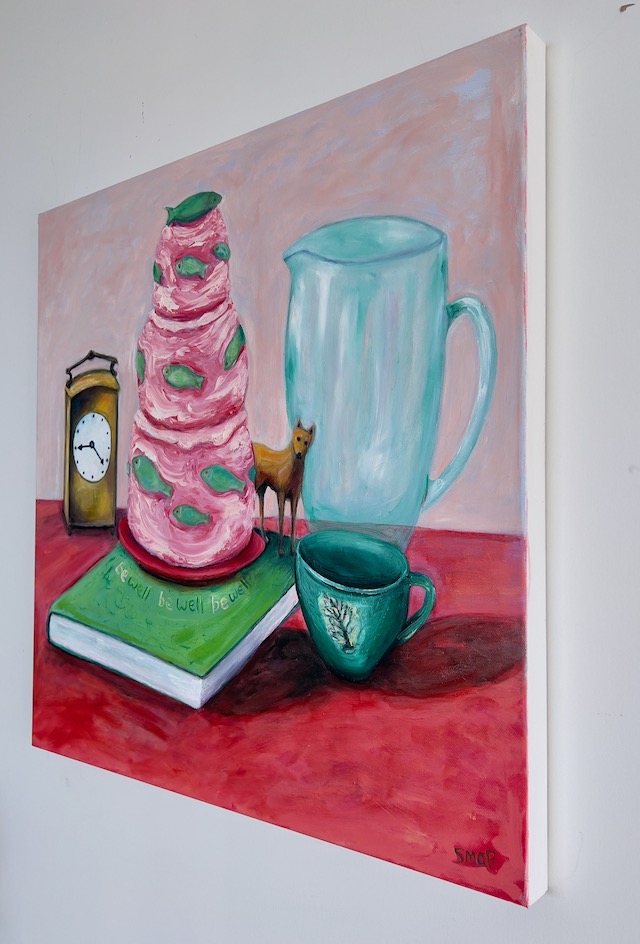 I'm obsessed about the ceramic cakes I made and enjoy painting them together with other treasured items. Each item has a story. The clock very basic travelling clock my Grandfather took with him to Suvla Bay in WW1. The cake is the ceramic creation Fish Out of Water Cake, inspired by the painting of the same name. Pink is warm, comforting and cheerful. The dog represents love and makes me smile. The cup is wonky because it was made by me. The jug is a green glass jug I use a lot. Well, well, well, is a wish and a question. Be Well is my blessing to the viewer.