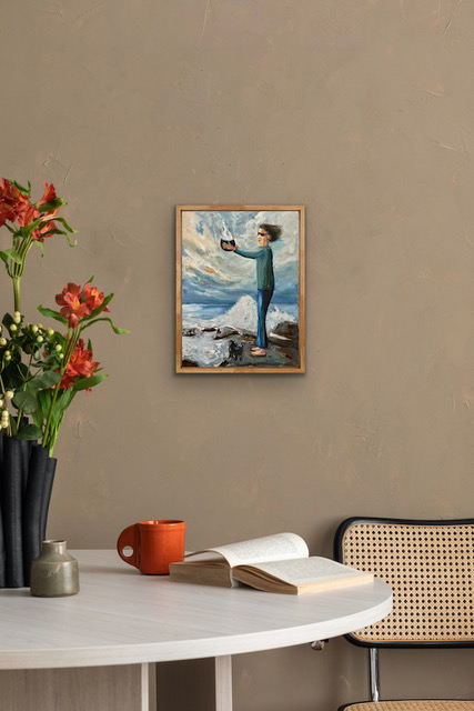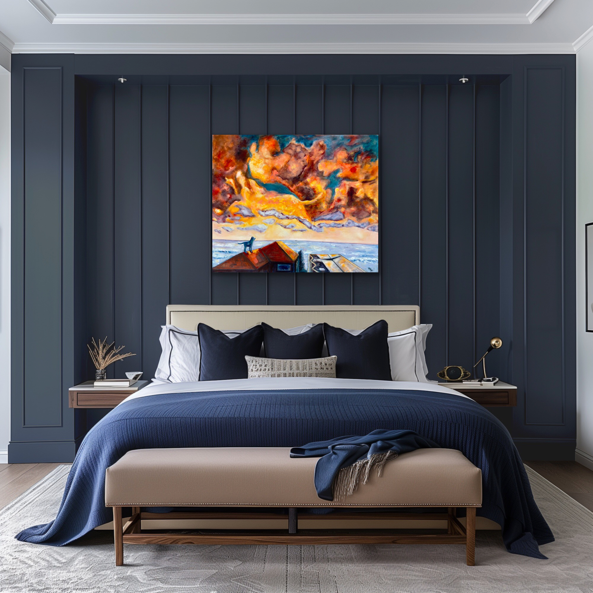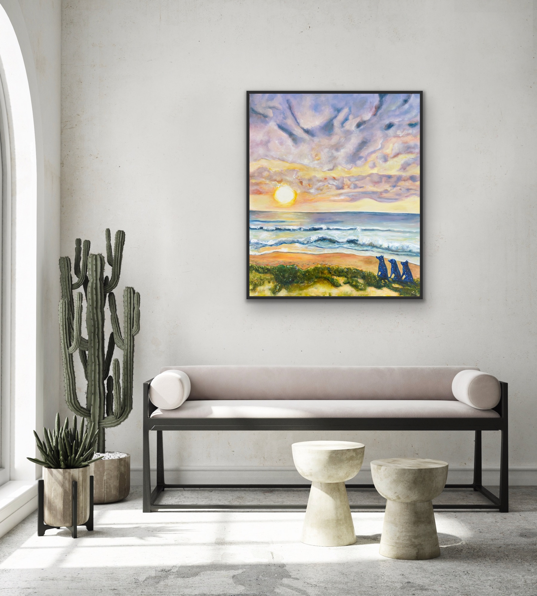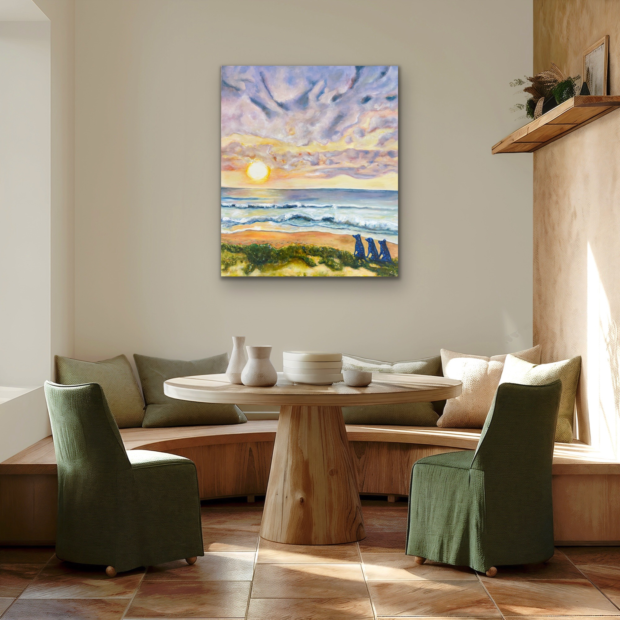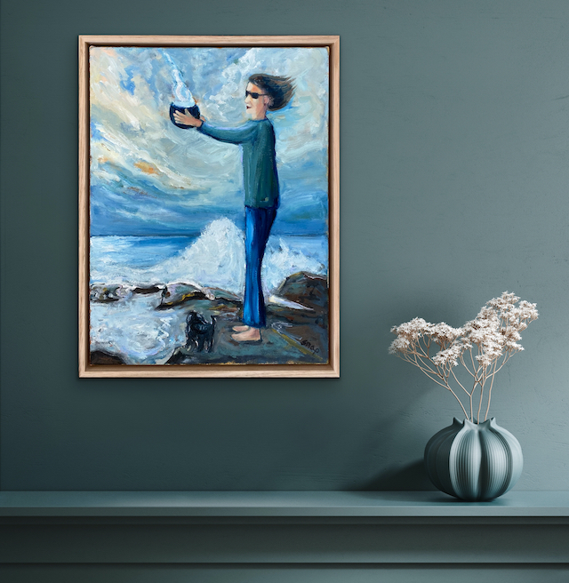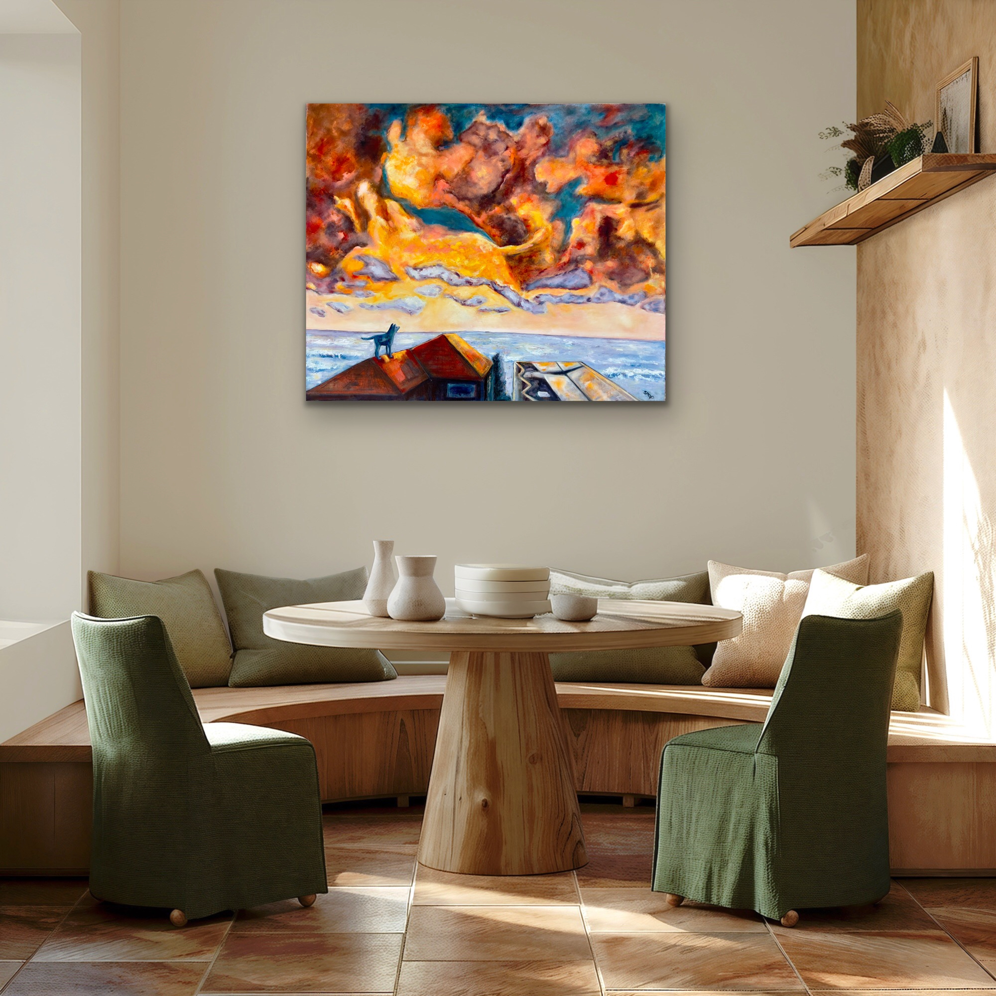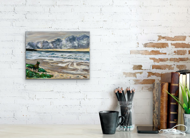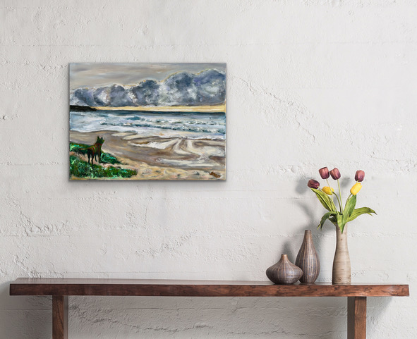 Blue Dog Dreams Pareidolia is a large oil painting on stretched canvas, with white gesso edges. The title refers to the tendency common with artists in particular, to see images and shapes in the clouds and rocks that look like something recognisable, like a face, animal or object. In this painting, the dog is transfixed by the magnificent dawn sky, inspired by one of the many gorgeous sunrises I am privileged to witness over Curl Curl beach each morning. Please note that if shipped outside Australia, I will remove from stretchers and send rolled in a tube.