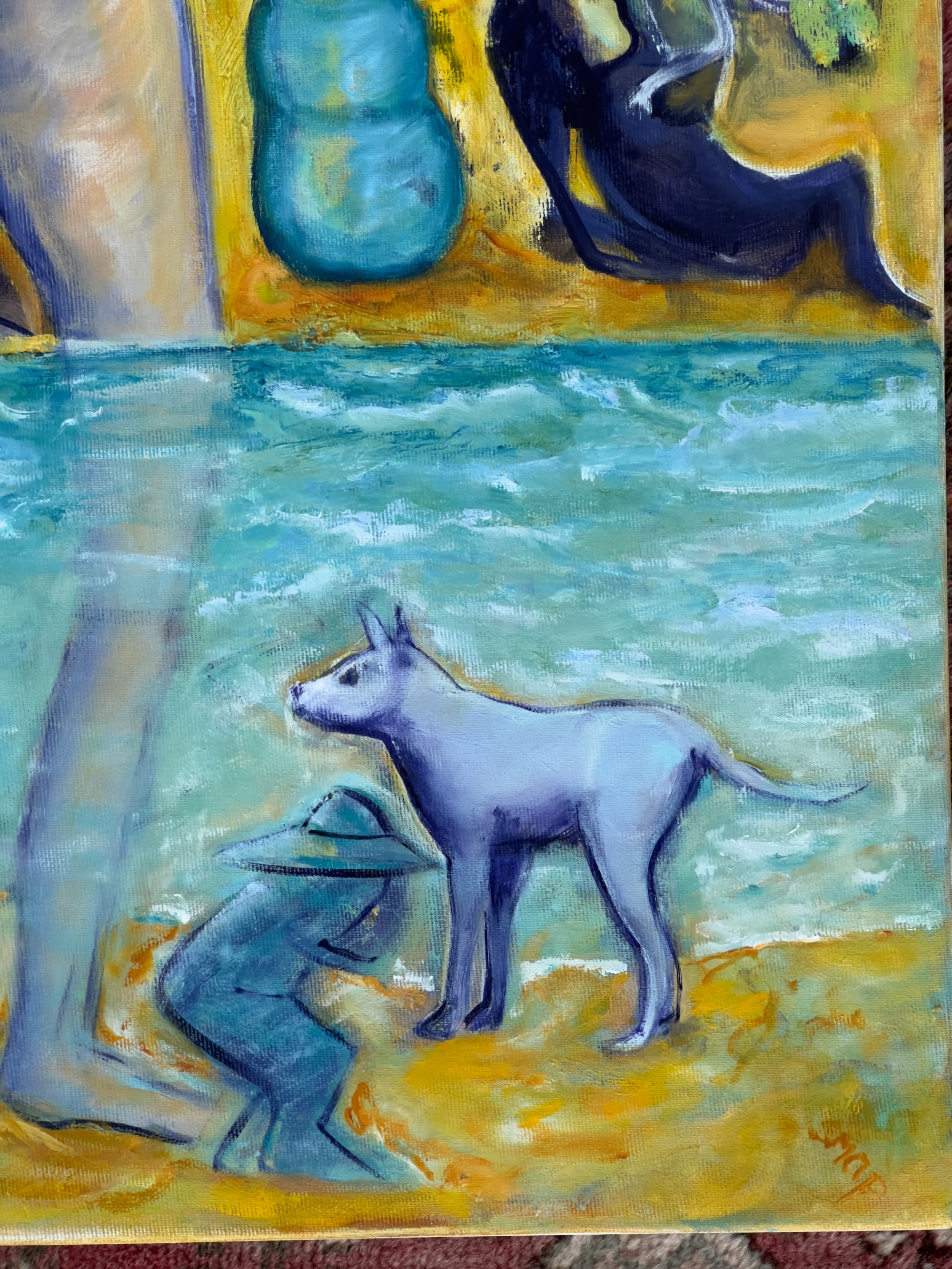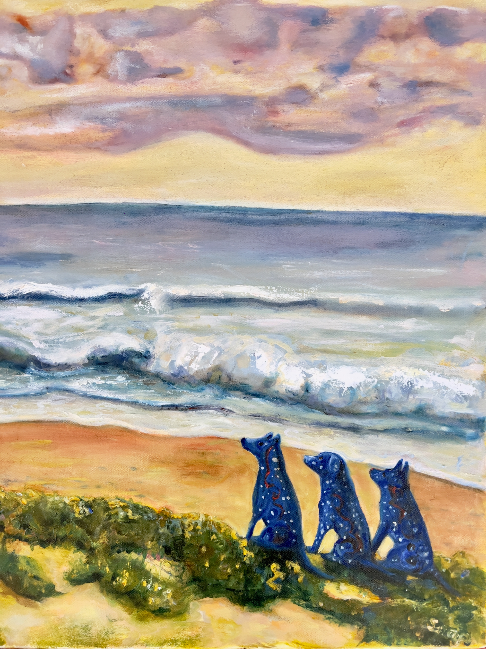 I am endlessly inspired by my local beach at Curl Curl. On this particular early morning, all the the clouds hung in the sky, suspended in a long dramatic line.. Dogs are everywhere. In my paintings they are often symbolic more than real - so I make them surreal. This one is green with red stripes (well, why not?). In my world, dogs symbolise unconditional love, awe, wonder and joy. They embody “the present moment” like no other creature on this planet (as far as I am aware). Perhaps I put them in my work to remind me that all these things are my aspirations.