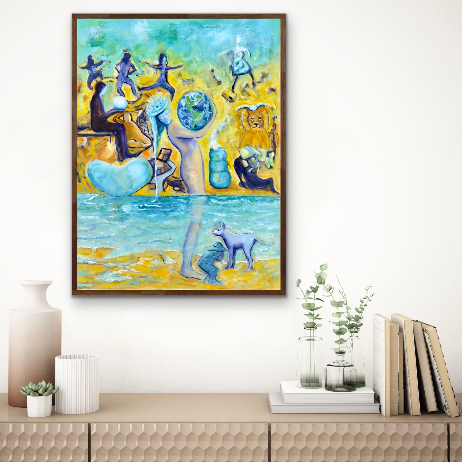 When I began this painting, I was thinking about kindness. The palette is significant, Green is the colour of the heart chakra. Turquoise is the colour of the throat chakra. Deep blues represent the third eye. There are numerous symbols connected to kindness from the figure with her arms wide open, to the teapot full of tea. The teardrops, red rose, musical notes and angelic beings and a doorway opening to something bright and light and a figure, honouring the moon. I am constantly seeking balance in every way, from the colours to the placement of symbols so that your eye keeps discovering new things.