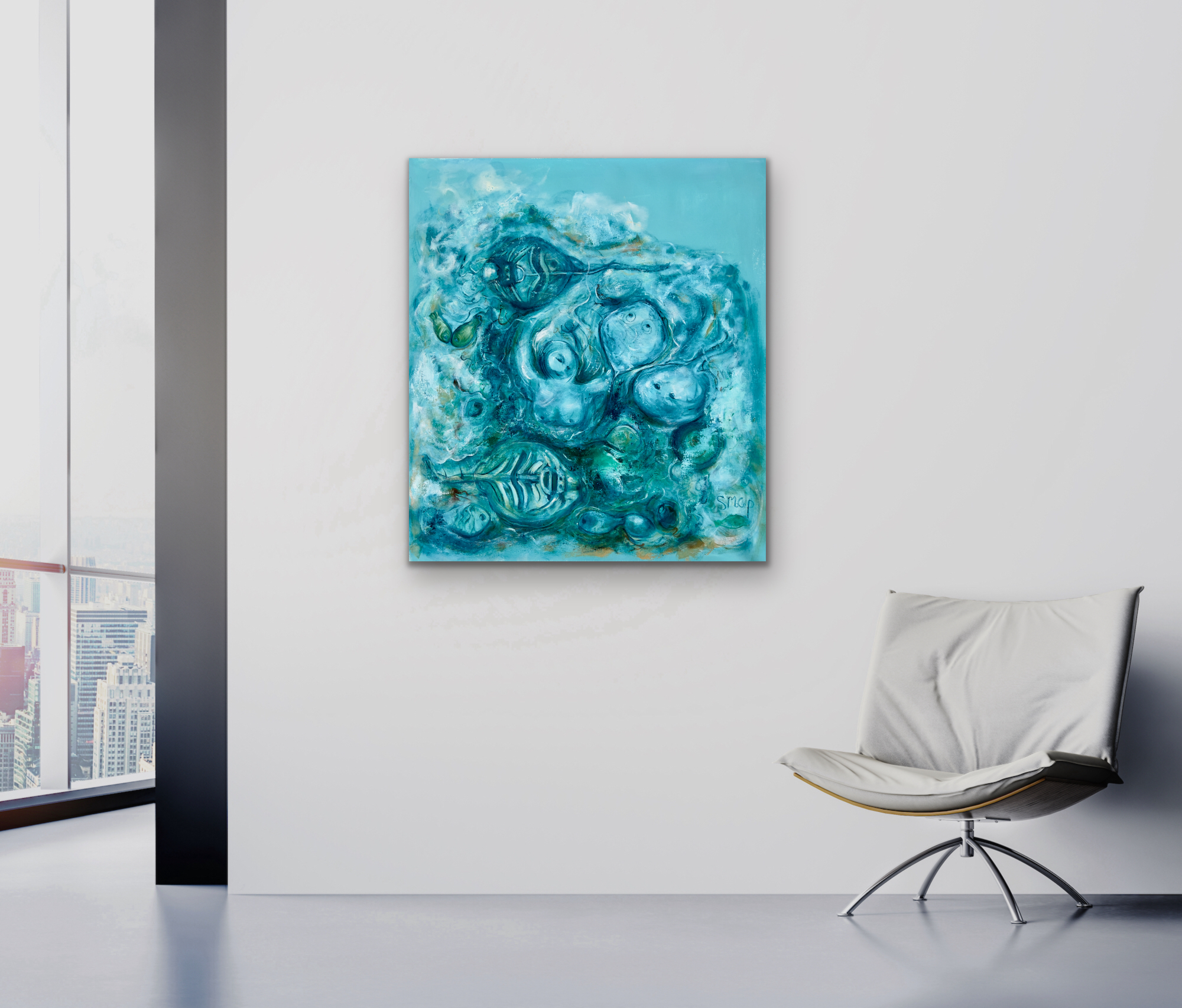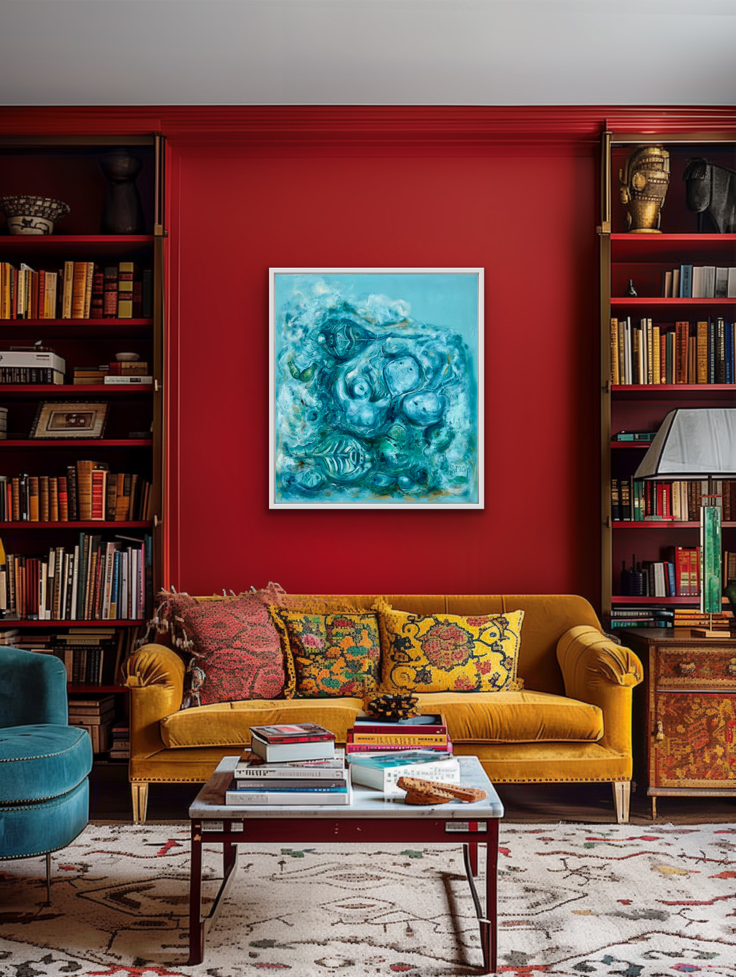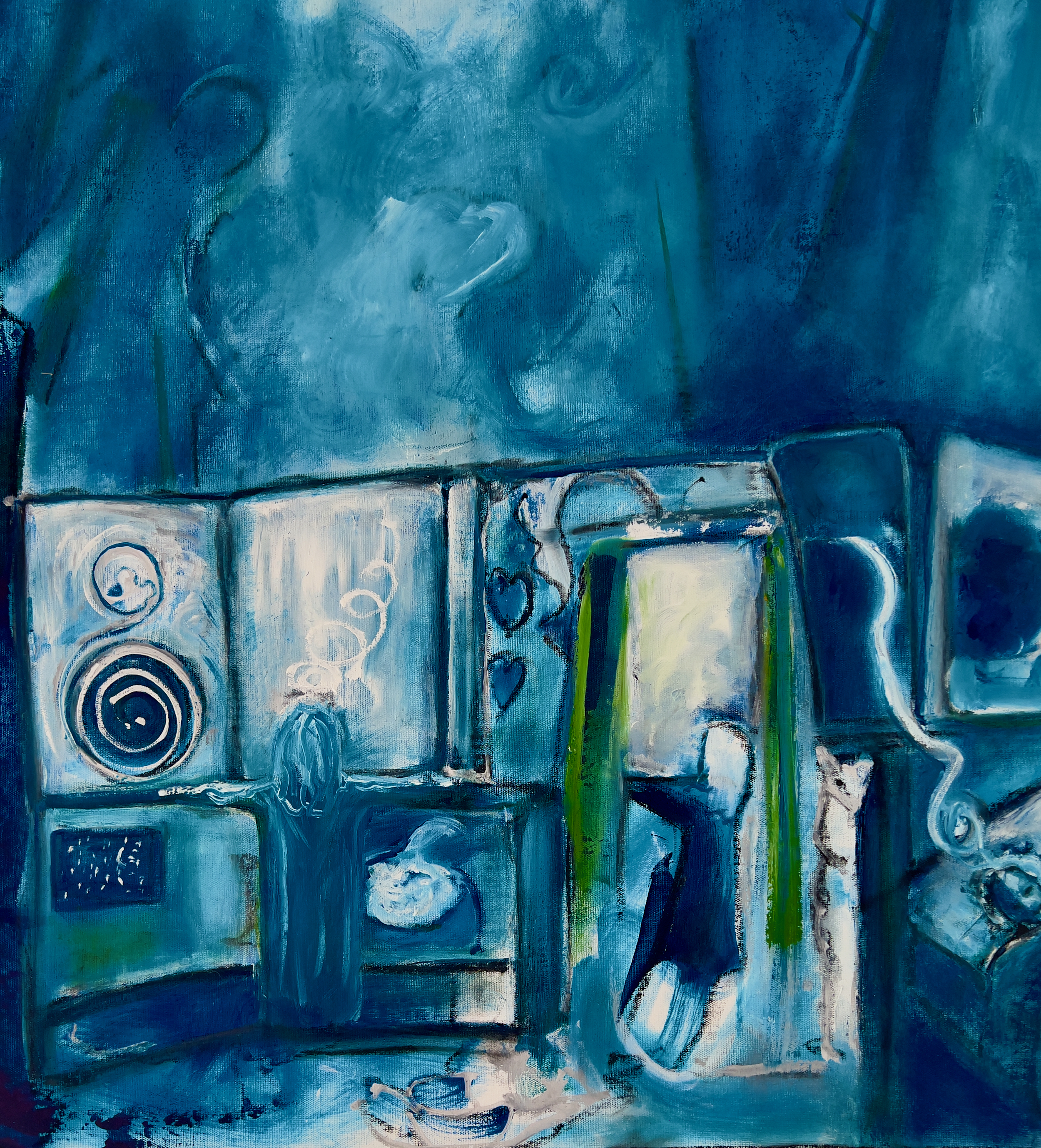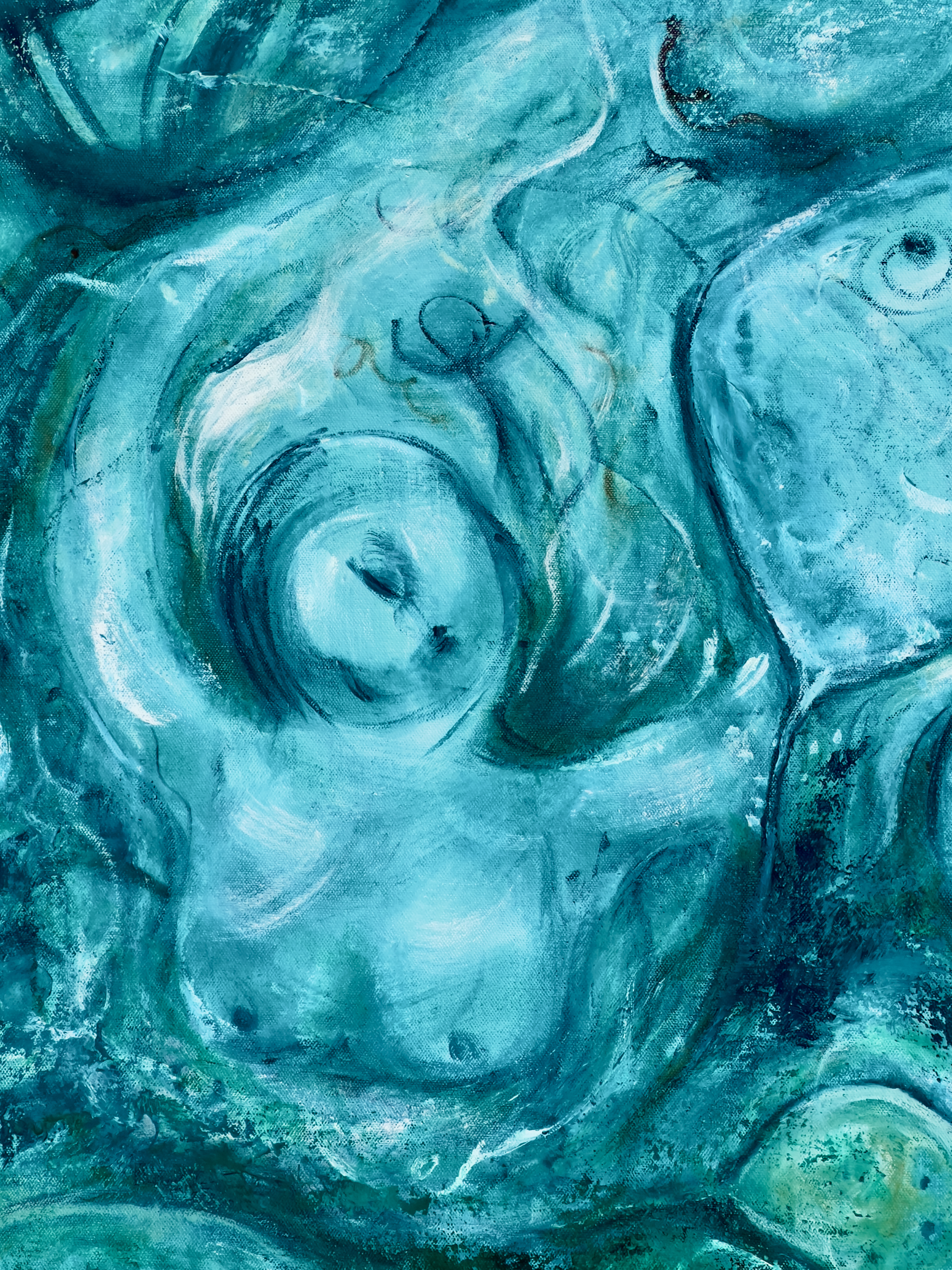 In deep water is the sister painting to Ayahuasca Dreaming . It’s a figurative abstract expressionist work (blimey, that's a mouthful) about Other Worlds and symbolic of where we are at this stage of our evolution as humans. It's quirky, it's whimsical, it's other worldly and it is one I'm proud of. Yes. I’ve been there and done that.
