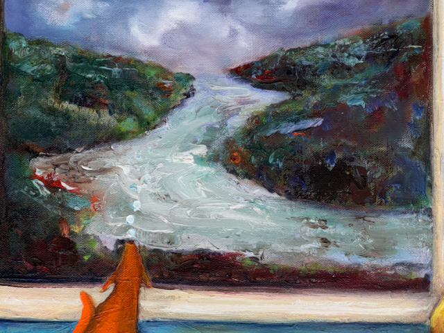This is one of those paintings. I don't want to explain too much about it - I'd much rather you projected your own meanings into it. Suffice to say, dreams are strange and fascinating things.. the royal road, as referred to by Carl Jung. A way of sorting out and processing lots of unfinished or unresolved stuff. Sometimes our dreams puzzle us. Sometimes we know exactly what they mean. Take time to let your eyes meander through the painting and delight in or be curious about the imagery. There are stories everywhere.